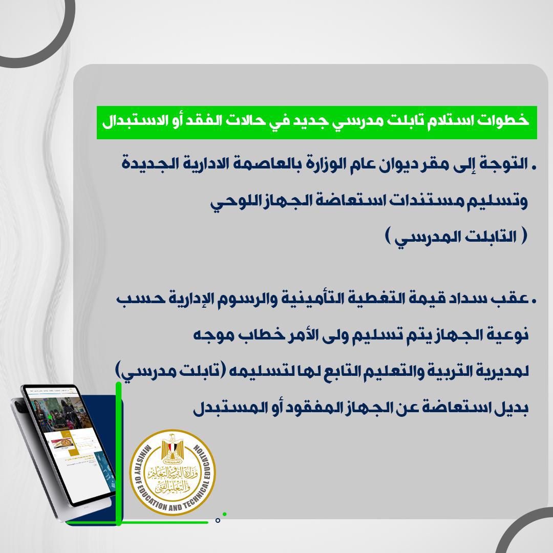 . عقب سداد قيمة التغطية التأمينية والرسوم الإدارية حسب نوعية الجهاز يتم تسليم ولى الأمر خطاب موجه لمديرية التربية والتعليم التابع لها لتسليمه (تابلت مدرسي) بديل استعاضة عن الجهاز المفقود أو المستبدل.