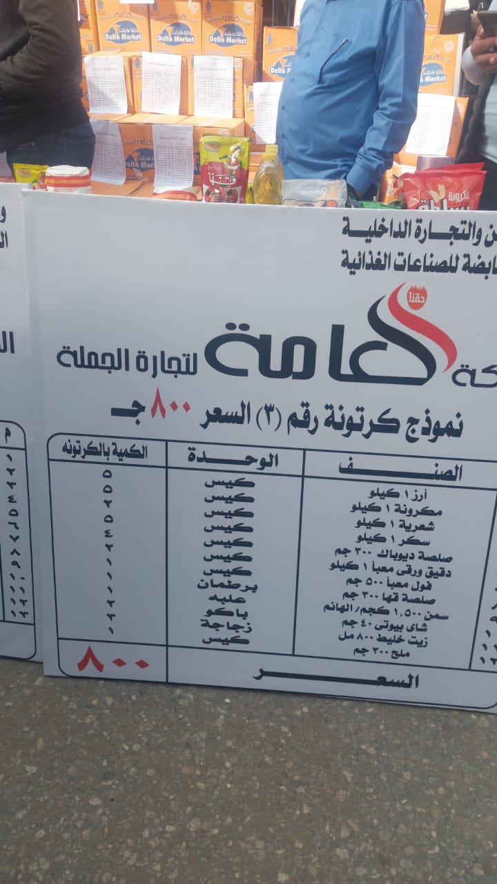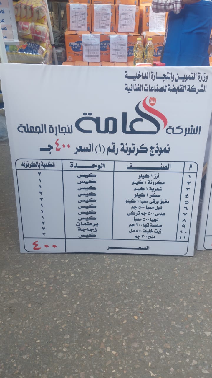 والكرتونه الأولى بسعر 400 جنيها، تشمل 11 صنفا من السلع الغذائية وتتضمن السلع التالية:
