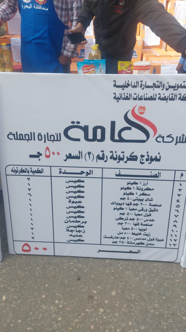 بينما الكرتونة الثانية بسعر 500 جنيه، وتضم هذه الكرتونة 13 صنفا وتتضمن السلع الغذائية التالية: