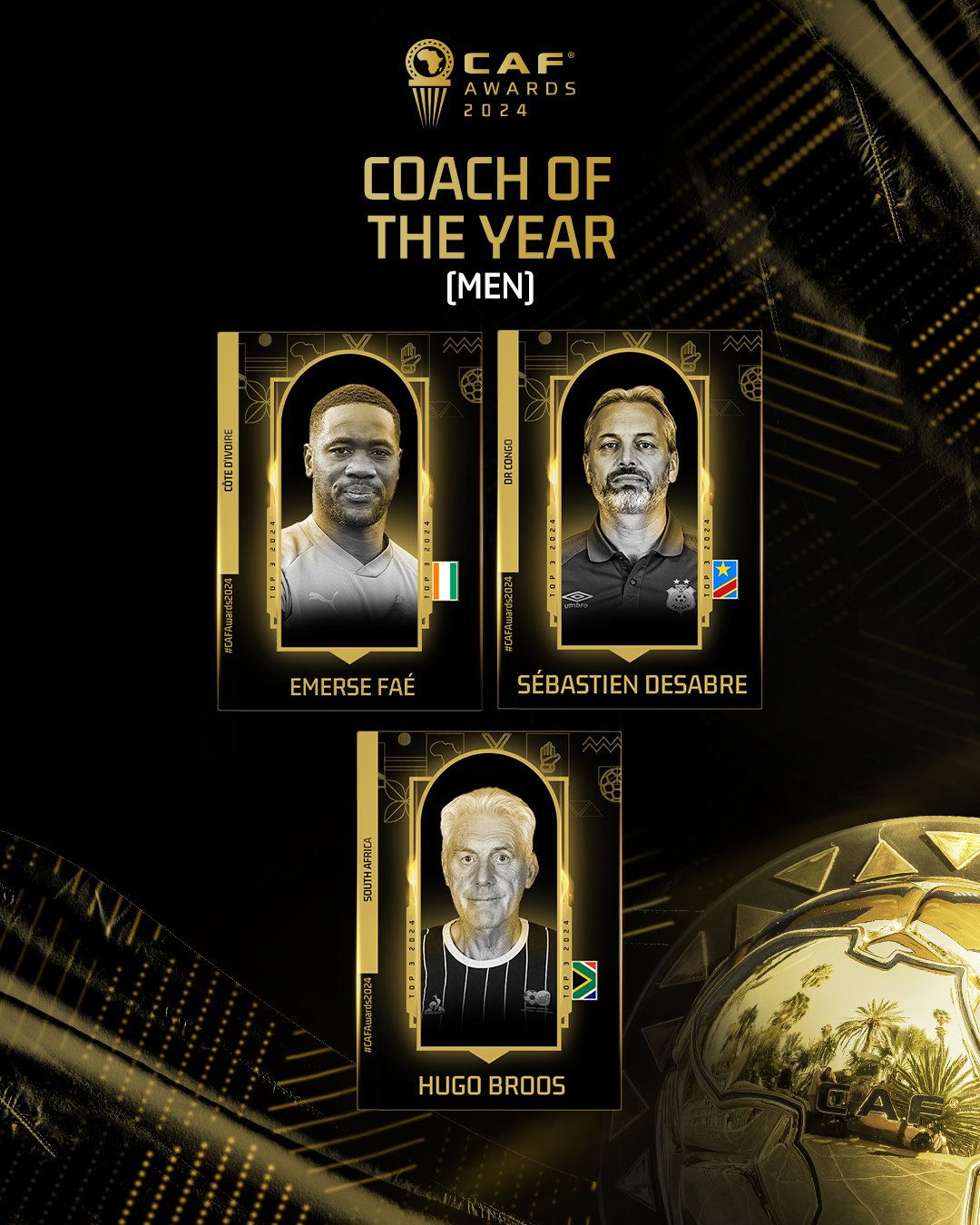 وتواجد في القائمة النهائية إيميرس فاييه المدير الفني لمنتخب كوت ديفوار المتوج مع منتخب بلاده ببطولة كأس الأمم الأفريقية الأخيرة، والفرنسي سيباستيان ديسابر المدير الفني لمنتخب الكونغو الديمقراطية والبلجيكي هوجو بروس مدرب منتخب جنوب أفريقيا.