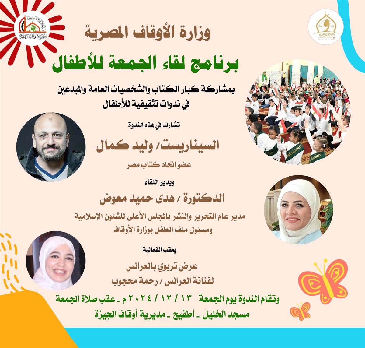 تطلق وزارة الأوقاف اليوم الجمعة ١٣ من ديسمبر ٢٠٢٤م الفعالية الكبرى “لقاء الجمعة للأطفال” من مسجد الخليل بأطفيح - محافظة الجيزة، في إطار حرصها على غرس القيم الدينية والأخلاقية والوطنية في نفوس الأطفال.