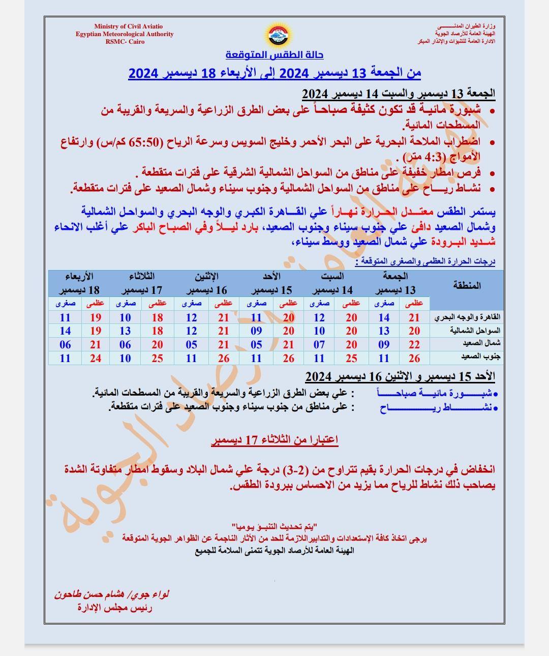 وقالت هيئة الأرصاد الجوية عبر صفحتها الرسمية بموقع التواصل الاجتماعي: "هناك شبورة مائية صباحًا قد تكون كثيفة أحيانًا على بعض الطرق الزراعية والسريعة والقريبة من المسطحات المائية مما يودي إلى انخفاض في الرؤية الأفقية".