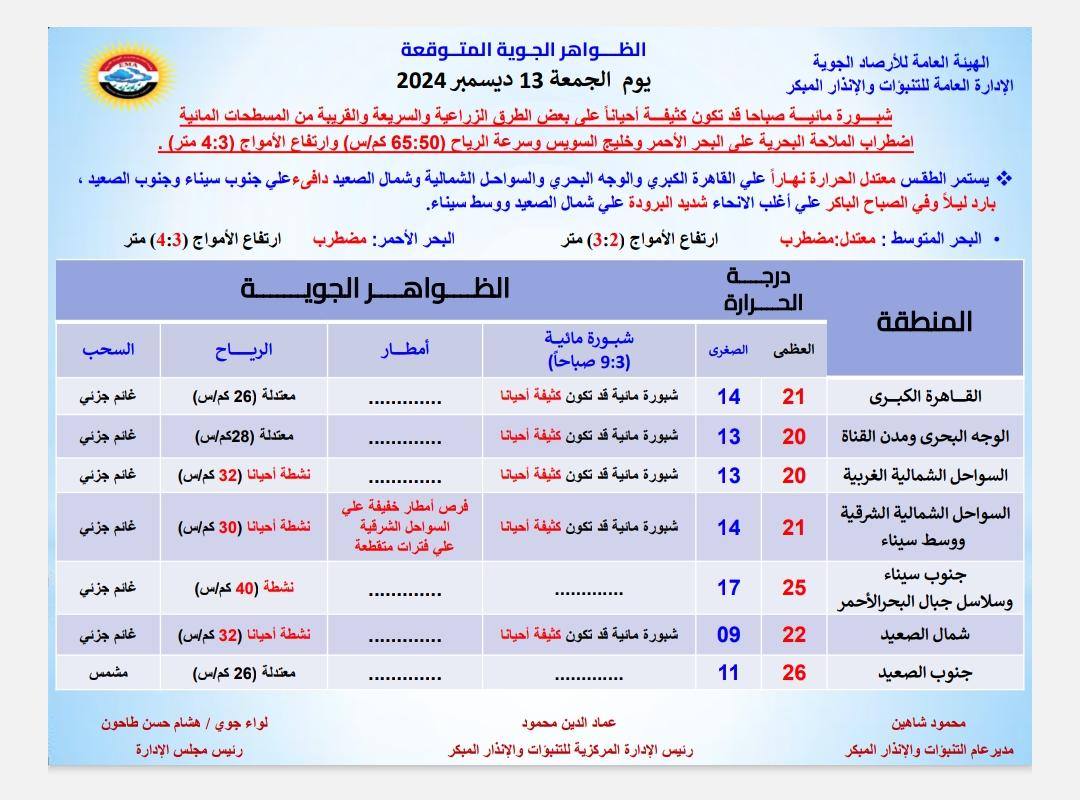 حذرت هيئة الأرصاد الجوية من حالة طقس اليوم الجمعة 13 ديسمبر 2024 وغدًا السبت الموافق 14 ديسمبر 2024، مؤكدة أن بحدوث اضطرابات وتقلبات جوية شديدة خلال الـ 48 ساعة المقبلة.