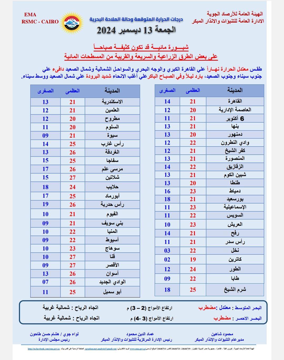 ونشرت هيئة الأرصاد الجوية بيانا بدرجات الحرارة المتوقعة اليوم الجمعة على مدن ومحافظات مصر، وجاءت كالتالي: