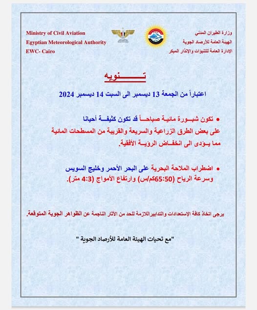 كما حذرت من اضطرابات ملاحية على البحر الأحمر وخليج السويس، مشيرة إلى أن سرعة الرياح تصل إلى 50 إلى 65 كم / في الساعة وارتفاع الأمواج من 3 إلى 4 أمتار.