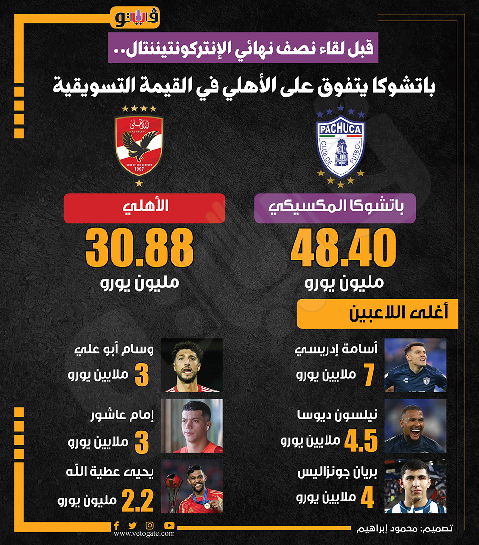 قبل لقاء نصف نهائي الإنتركونتيننتال.. باتشوكا يتفوق على الأهلي في القيمة التسويقية (إنفوجراف)