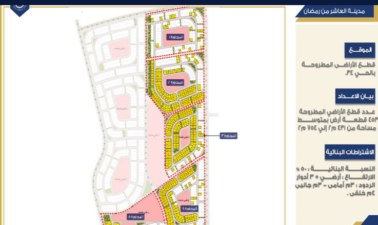 وتطرح بمدينة العاشر من رمضان 1270 قطعة أرض بمساحة 396 - 773 متر مربع بمتوسط سعر 7377 جنيه للمتر