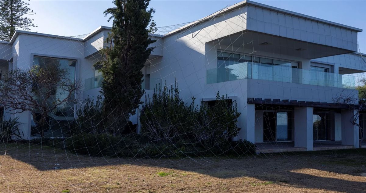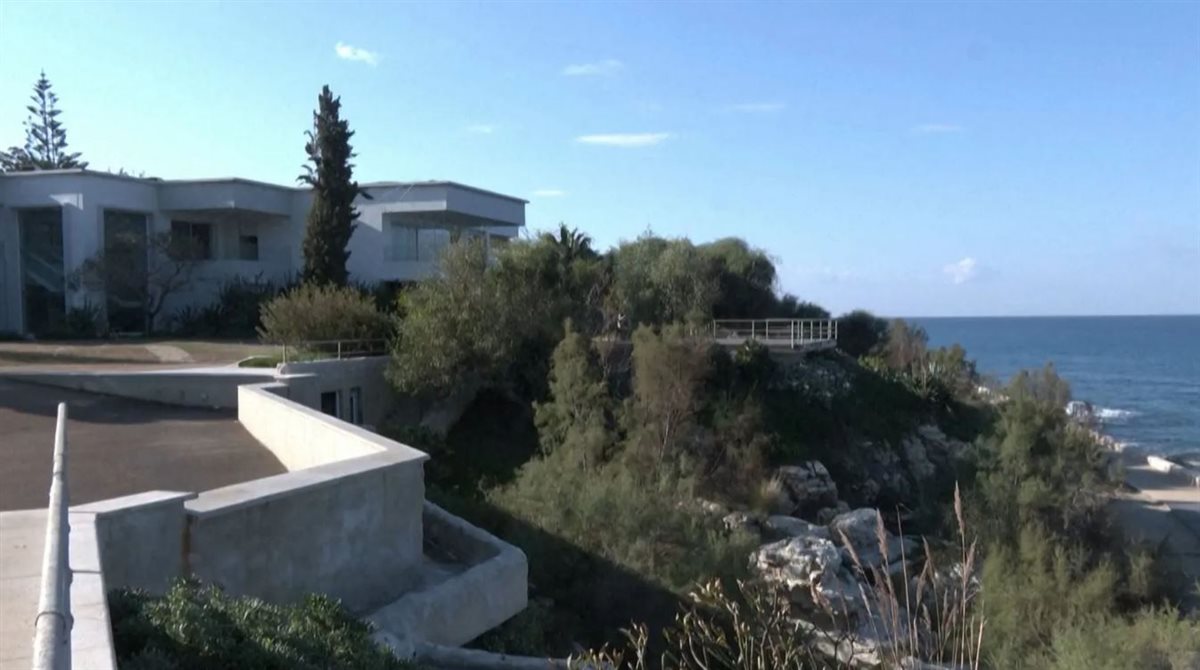ويضم المجمع فيلا بيضاء بشرفات تطل على البحر المتوسط وشاطئ خاص وعدة حدائق ومسار للمشي.
