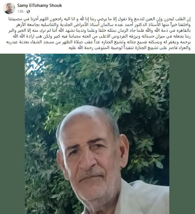 توفي مساء أمس الجمعة، الدكتور أحمد عبده سالمان، أستاذ الأمراض الجلدية والتناسلية بكلية طب جامعة الأزهر والملقب بـ"طبيب الغلابة" في الإسماعيلية.