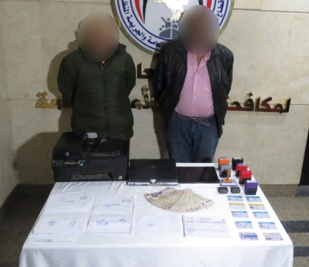 وعقب تقنين الإجراءات تم ضبطهما ، وبحوزتهما (عدد من الأختام والأكلاشيهات لجهات وأسماء مختلفة – عدد من التقارير والكروت والخطابات والكارنيهات ونماذج الكارنيهات منسوب صدورها لجهات مختلفة "معدة للتزوير"- مبالغ مالية "متحصلات نشاطهما الإجرامى" – طابعة - الأجهزة المستخدمة فى التزوير "بفحصها تبين إحتواء الأجهزة الإلكترونية على دلائل تؤكد نشاطهما الإجرامى).