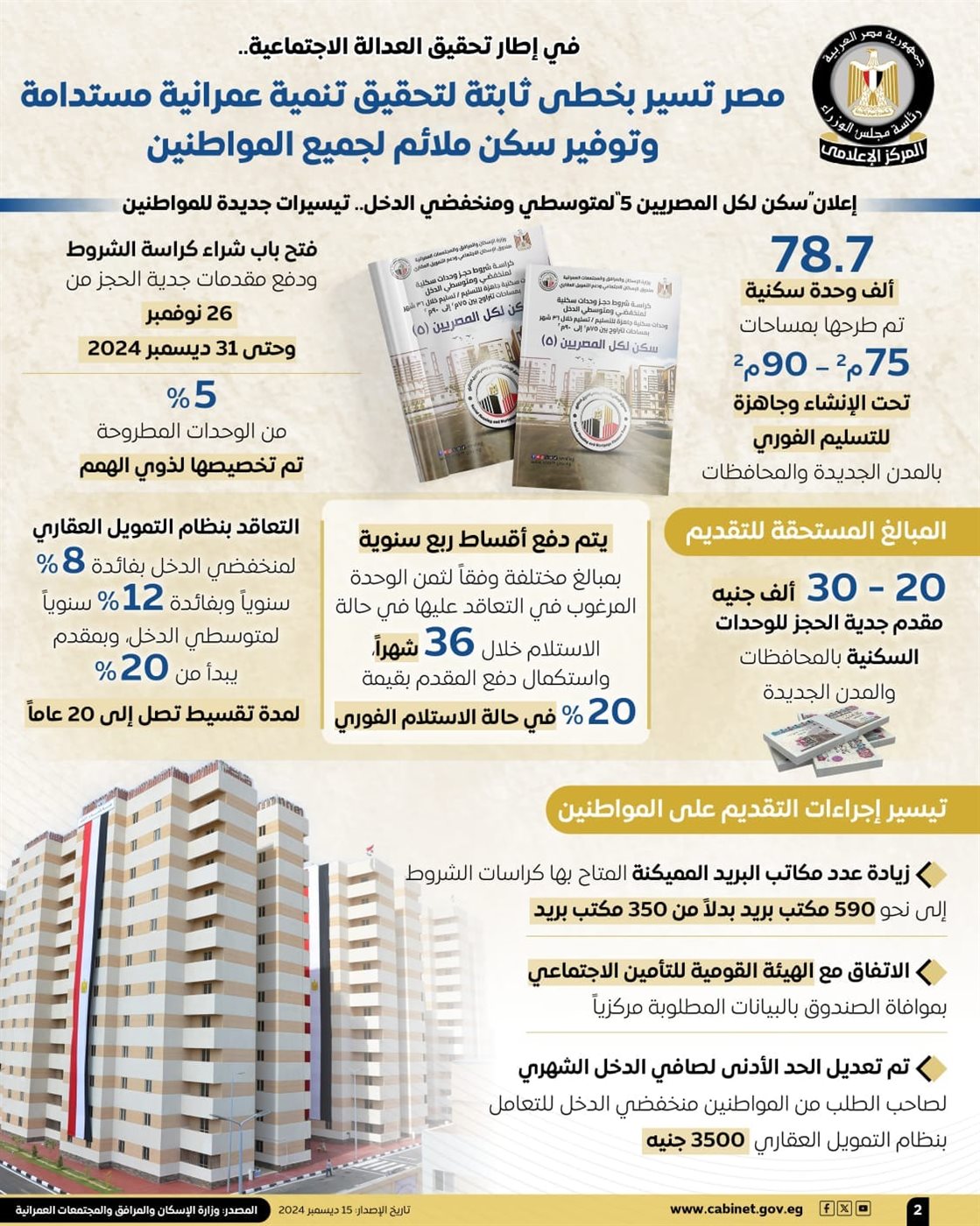 ويأتي هذا بينما، تطرق التقرير إلى إعلان سكن لكل المصريين 5 لمتوسطي ومنخفضي الدخل بتيسيرات جديدة للمواطنين، والذي يتضمن طرح 78.7 ألف وحدة سكنية بمساحات تتراوح من 75 م2 إلى 90 م2، مقسمة إلى وحدات تحت الإنشاء وأخرى جاهزة للتسليم الفوري بالمدن الجديدة والمحافظات، وقد تم فتح باب شراء كراسة الشروط ودفع مقدمات جدية الحجز من 26 نوفمبر 2024 حتى 31 ديسمبر 2024، علمًا بأنه تم تخصيص 5% من الوحدات المطروحة لذوي الهمم.