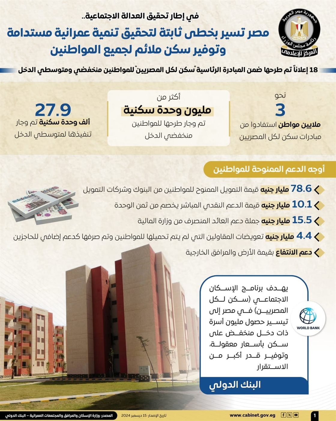 وفي هذا الصدد نشر المركز الإعلامي لمجلس الوزراء، تقريرًا تضمن إنفوجرافات تسلط الضوء على حرص الدولة المصرية على السير بخطى ثابتة لتحقيق تنمية عمرانية مستدامة وتوفير سكن ملائم لجميع المواطنين، وذلك في إطار تحقيق العدالة الاجتماعية.