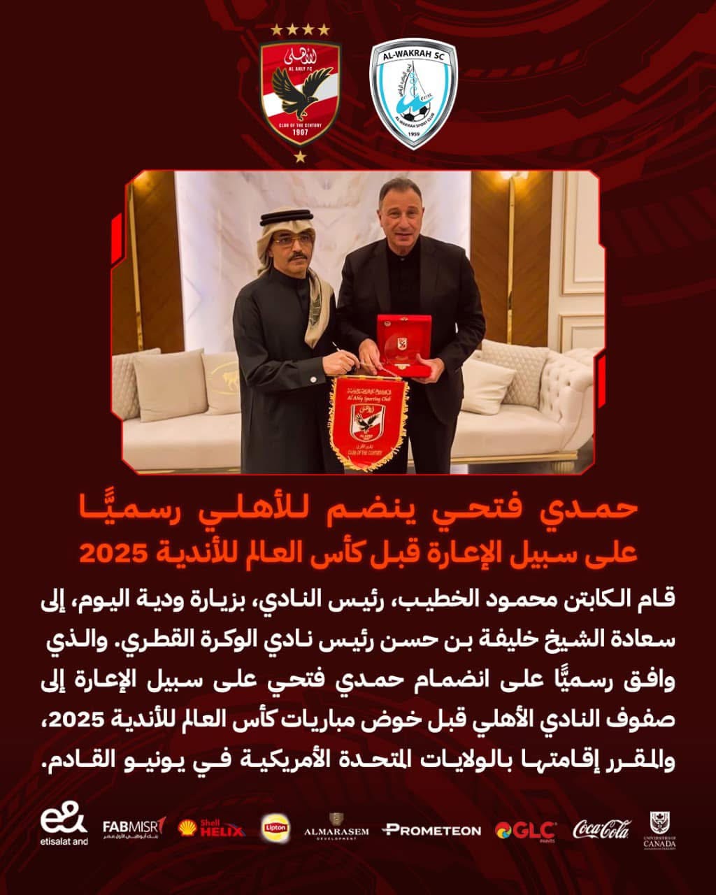 وأعلن النادي الأهلي رسميا، التعاقد مع حمدي فتحي لاعب الوكرة القطري علي سبيل الإعارة قبل منافسات بطولة كأس العالم للأندية 2025، والمقرر إقامتها في الولايات المتحدة الأمريكية.