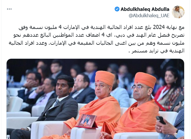 كشف السياسي الإماراتي الدكتور عبد الخالق عبد الله، أستاذ العلوم السياسية بجامعة الإمارات سابقًا، أن عدد أفراد الجالية الهندية في الإمارات يبلغ 4 ملايين نسمة في نهاية 2024، أي يبلغ عدد أفراد الجالية الهندية في الإمارات 4 أضعاف عدد سكان الإمارات.