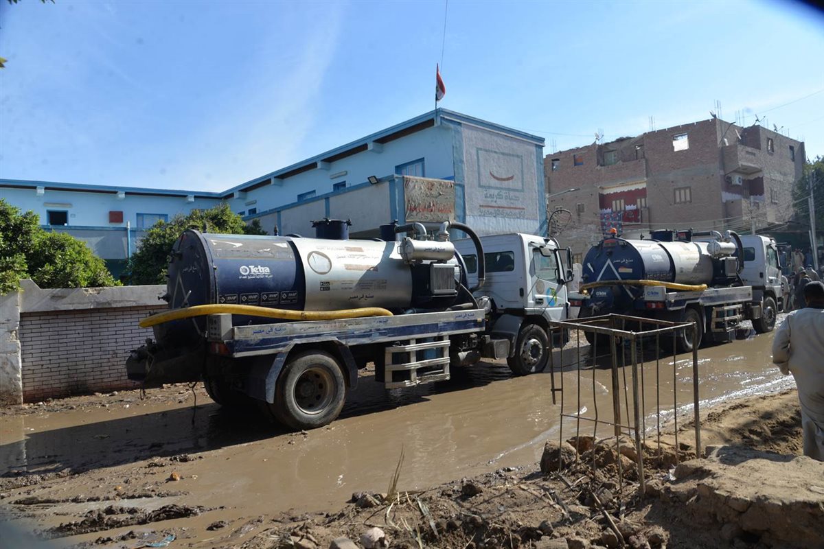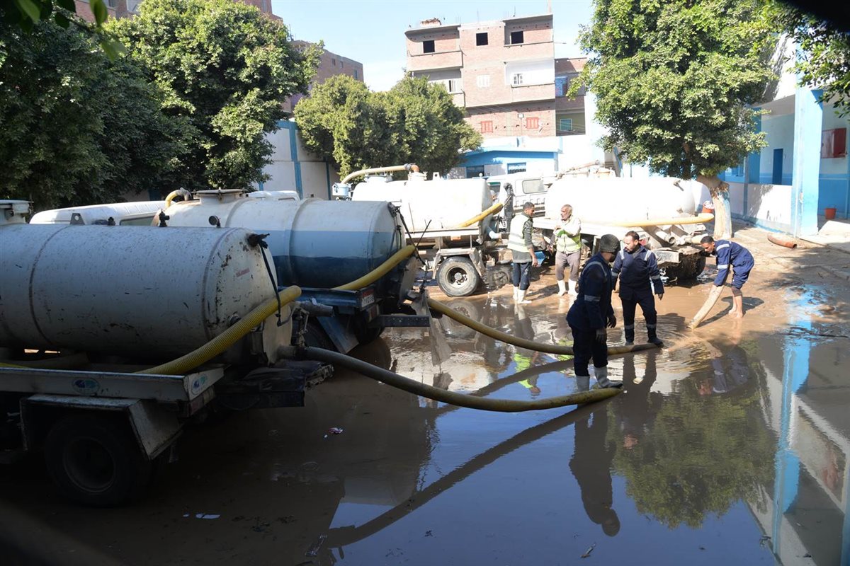 الدفع بـ 15 سيارة لكسح مياه انفجار خط طرد صرف صحي العتامنة بأسيوط|صور