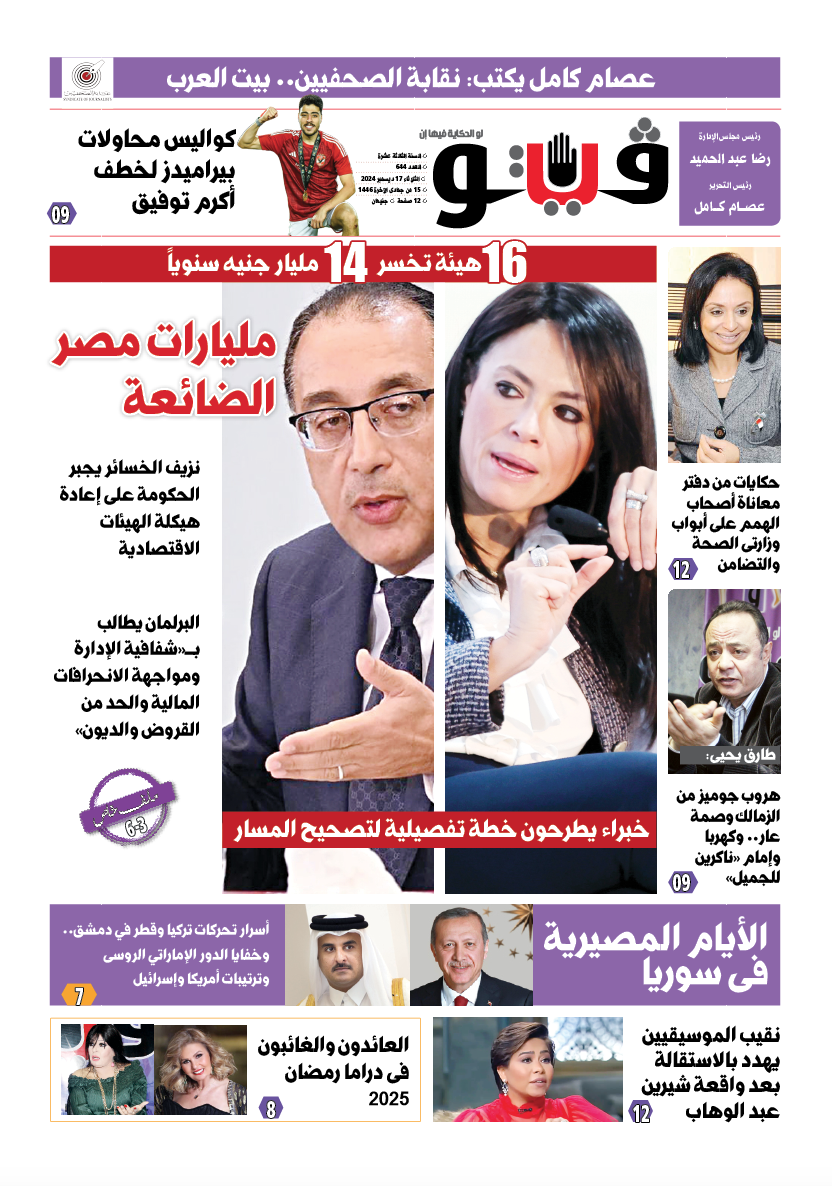 تكشف فيتو في عددها الجديد عن نزيف الخسائر التي تتعرض لها الهيئات الحكومية والتي تقدر 14 مليار جنيه سنويًا ، والتي طالب البرلمان بسببها «شفافية الإدارة ومواجهة الانحرافات المالية والحد من القروض والديون».