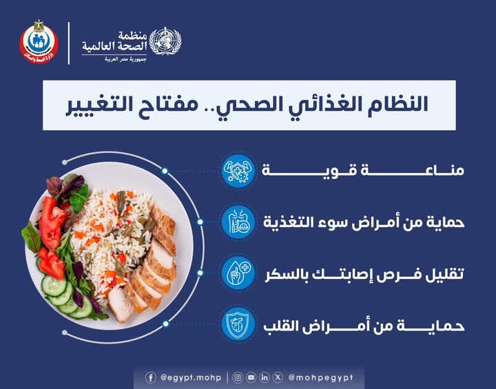 وأكدت وزارة الصحة ضرورة الاهتمام بتناول نظام غذائي صحي يمنح مناعة قوية، ويقلل من فرص الإصابة بالأمراض كالسكر والقلب وسوء التغذية.