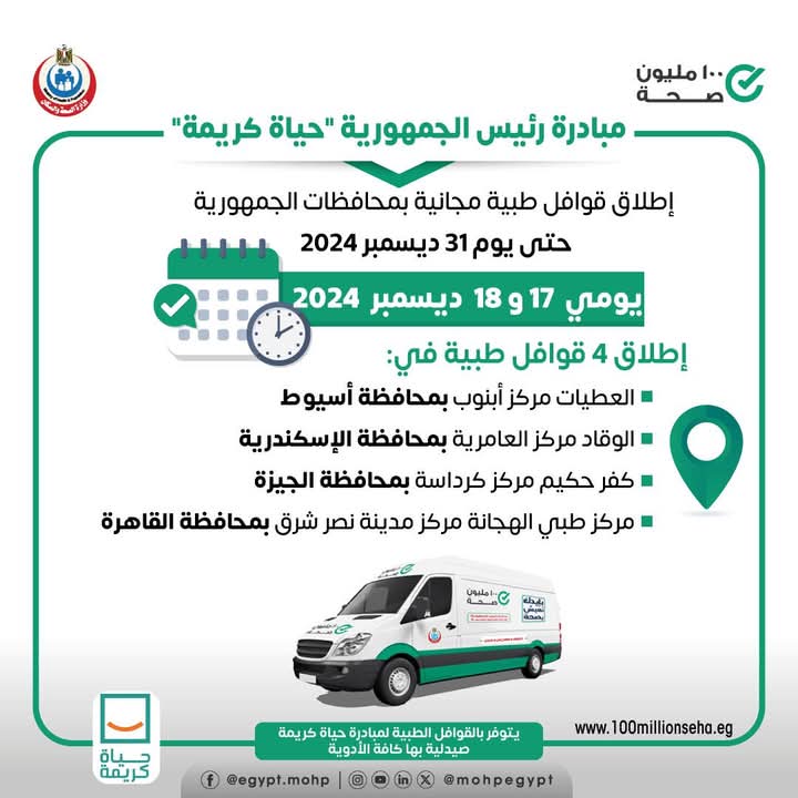 أعلنت وزارة الصحة إطلاق ٤ قوافل طبية ضمن مبادرة رئيس الجمهورية حياة كريمة