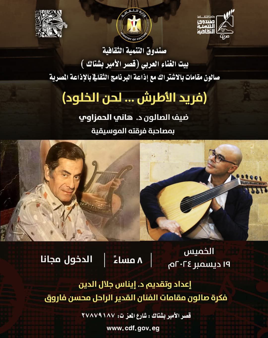 يستضيف بيت الغناء العربي بقصر الأمير بشتاك - بشارع المعز لدين الله الفاطمي - التابع لقطاع صندوق التنمية الثقافية، في الثامنة مساء الخميس الموافق 19 ديسمبر، أمسية جديدة من أمسيات صالون مقامات بعنوان "فريد الأطرش.. لحن الخلود"، إعداد وتقديم الناقدة الموسيقية الدكتورة إيناس جلال الدين وفي ضيافتها الدكتور هاني الحمزاوي وفرقته الموسيقية.