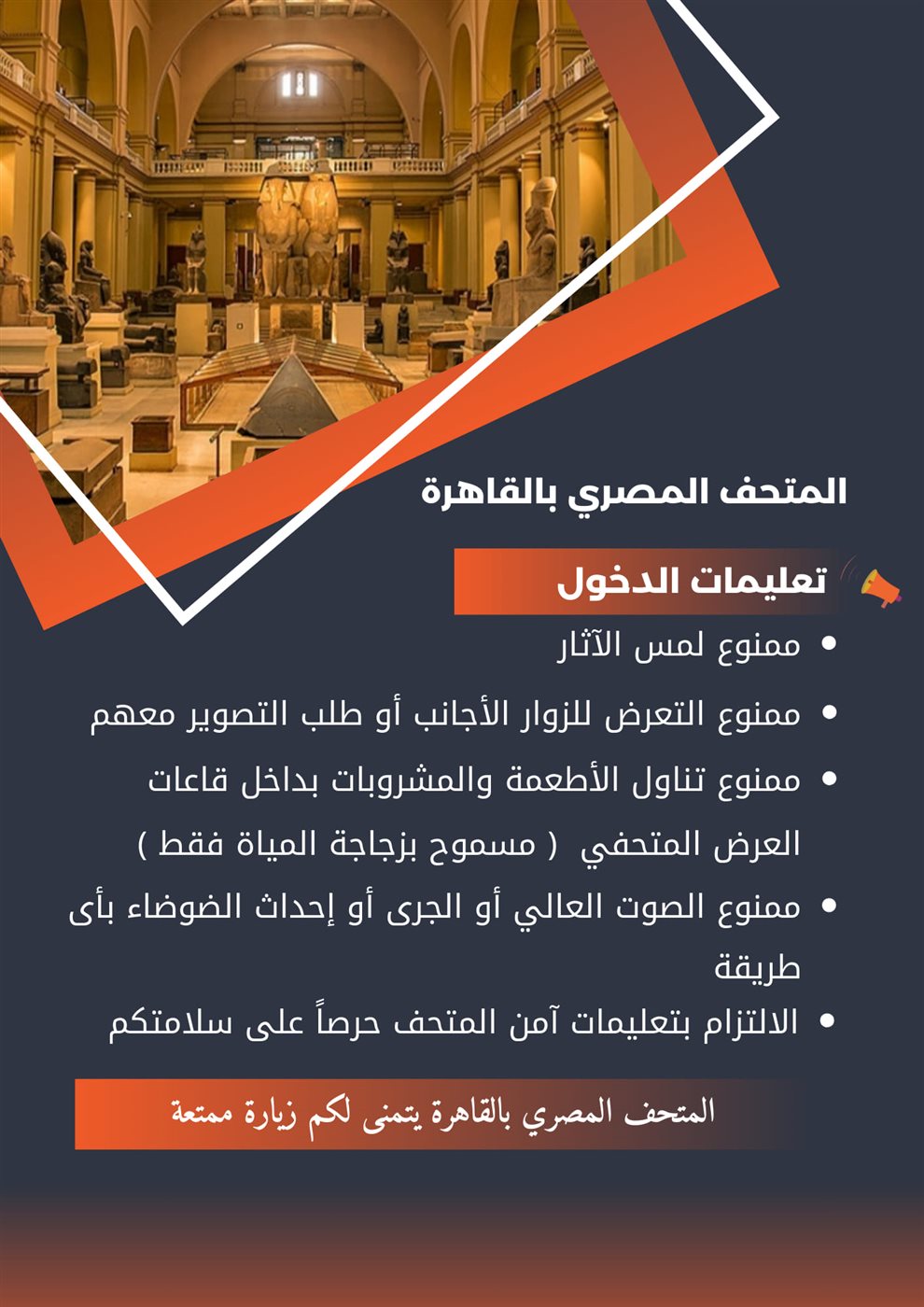 - ممنوع تناول الأطعمة والمشروبات بداخل قاعات العرض المتحفي (مسموح بزجاجة المياة فقط)