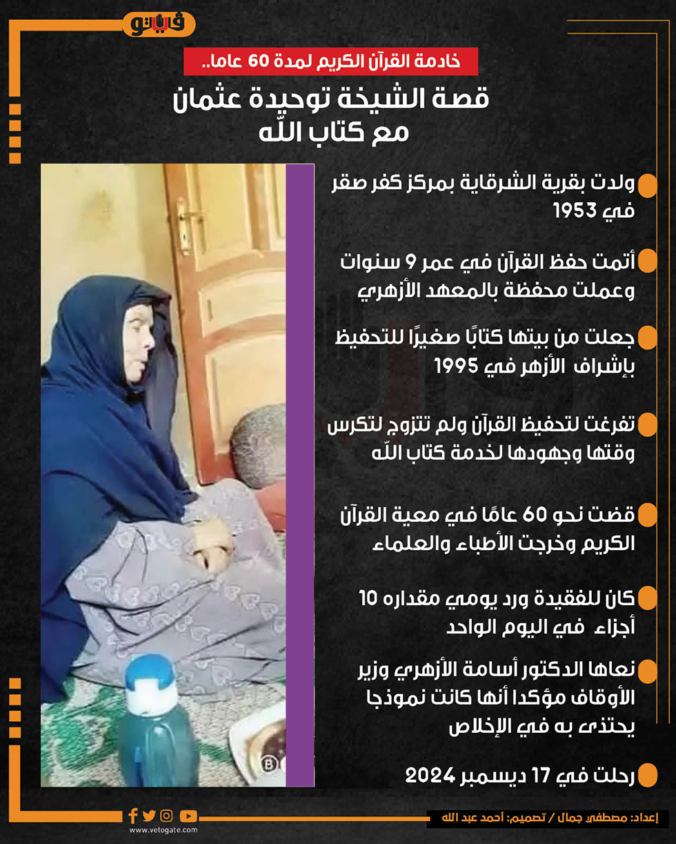 خادمة القرآن الكريم لمدة 60 عاما.. قصة الشيخة توحيدة عثمان مع كتاب الله (إنفوجراف)