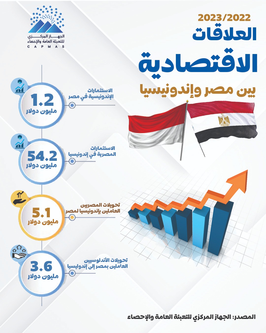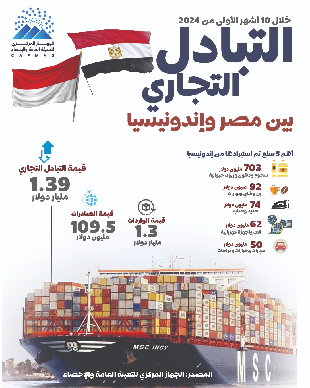 الإحصاء: 1.39 مليار دولار قيمة التبادل التجاري بين مصر وإندونيسيا خلال 10 أشهر