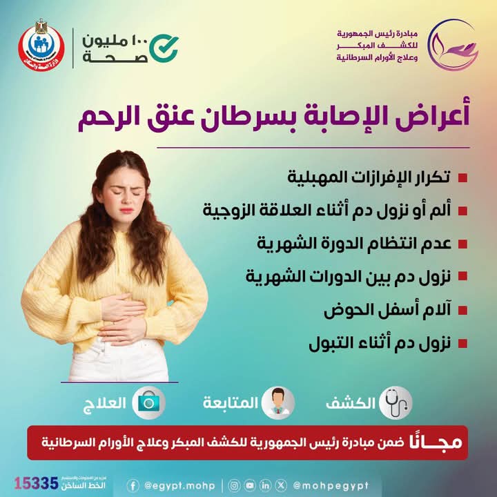 وكشفت وزارة الصحة عن أهم أعراض الإصابة بسرطان عنق الرحم منها: