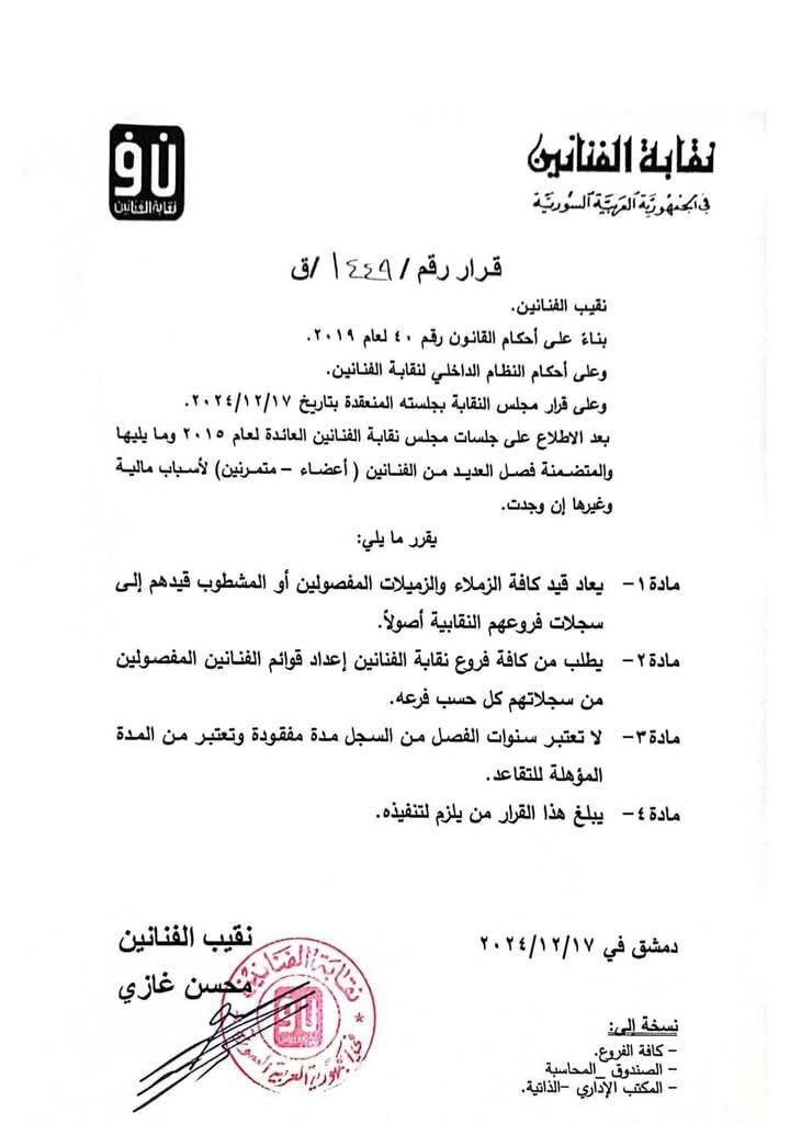 وجاء في البيان الصادر عن نقيب الفنانين محسن غازي أنه بعد الاطلاع على جلسات مجلس نقابة الفنانين العائدة لعام 2015 وما يليها والمتضمنة فصل العديد من الفنانين لأسباب مالية وغيرها إن وجدت: