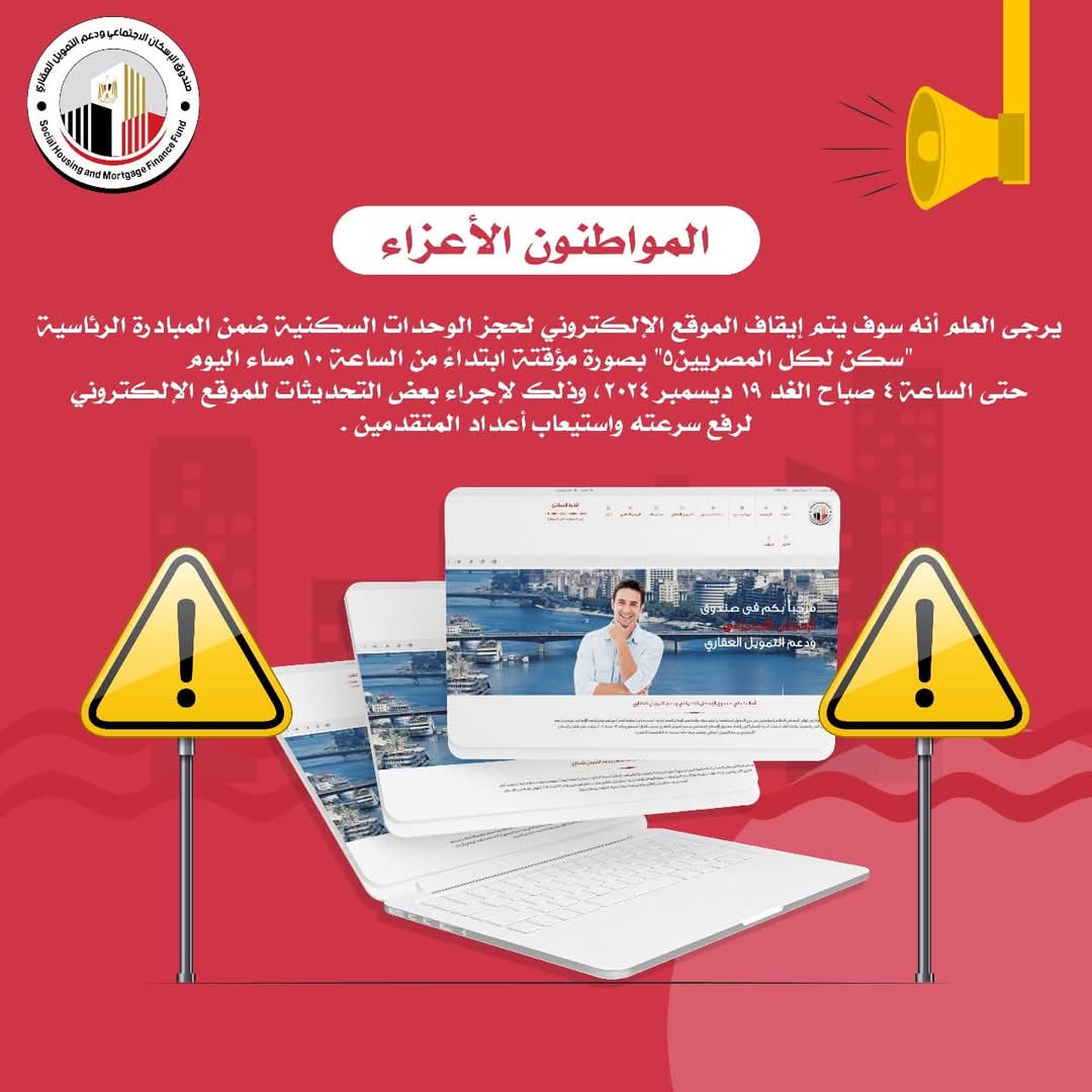 اعلن صندوق الإسكان الاجتماعي ودعم التمويل العقاري عن إيقاف التقديم على شقق سكن لكل المصريين 5 بصورة مؤقتة مساء اليوم حتى الساعة 4 من صباح غد الخميس 19 ديسمبر وذلك لإجراء بعض التحديثات على الموقع.