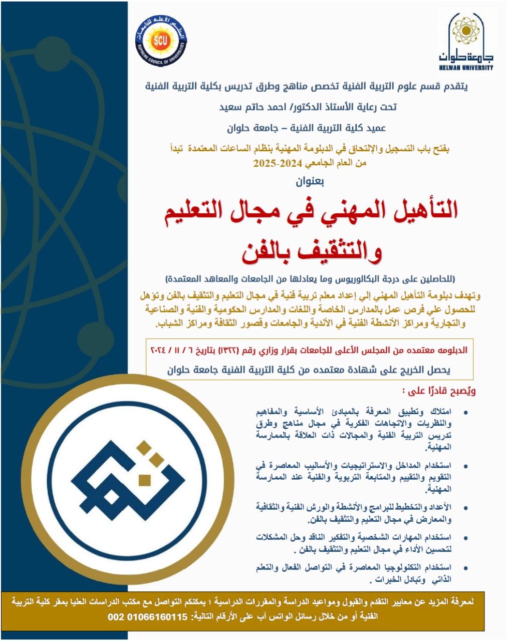 أعلن قسم علوم التربية الفنية تخصص مناهج وطرق تدريس بكلية التربية الفنية بـ جامعة حلوان، تحت رعاية الدكتور السيد قنديل رئيس الجامعة، الدكتور أحمد حاتم سعيد، عميد الكلية، عن فتح باب التسجيل في دبلومة "التأهيل المهني في مجال التعليم والتثقيف بالفن" للعام الجامعي 2024-2025.