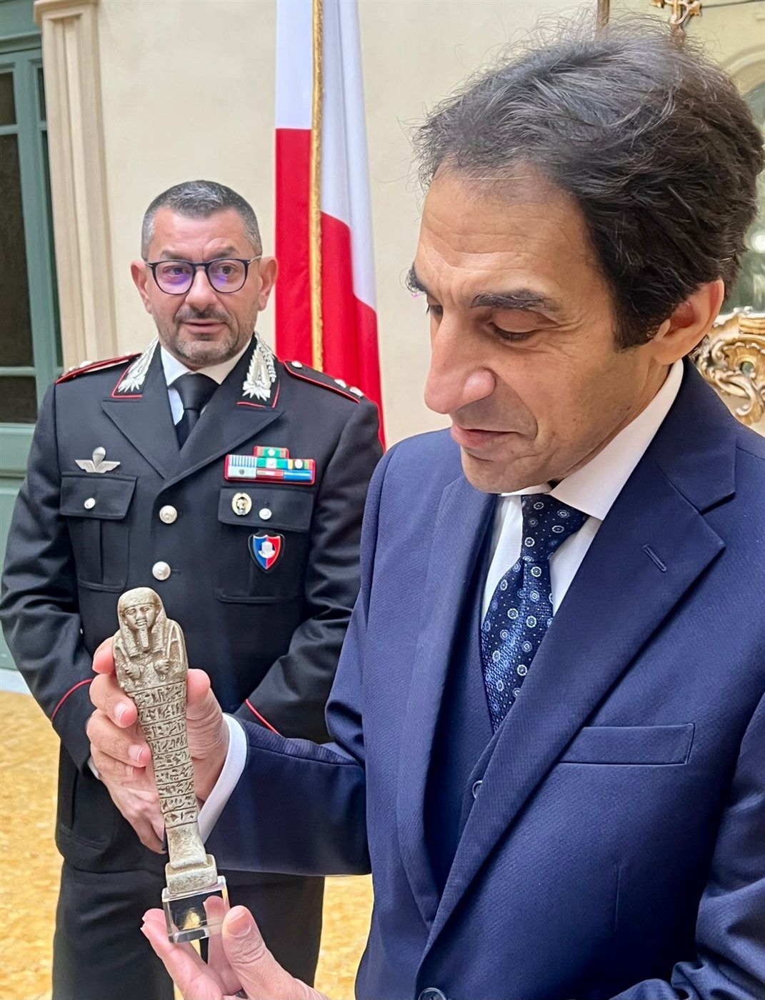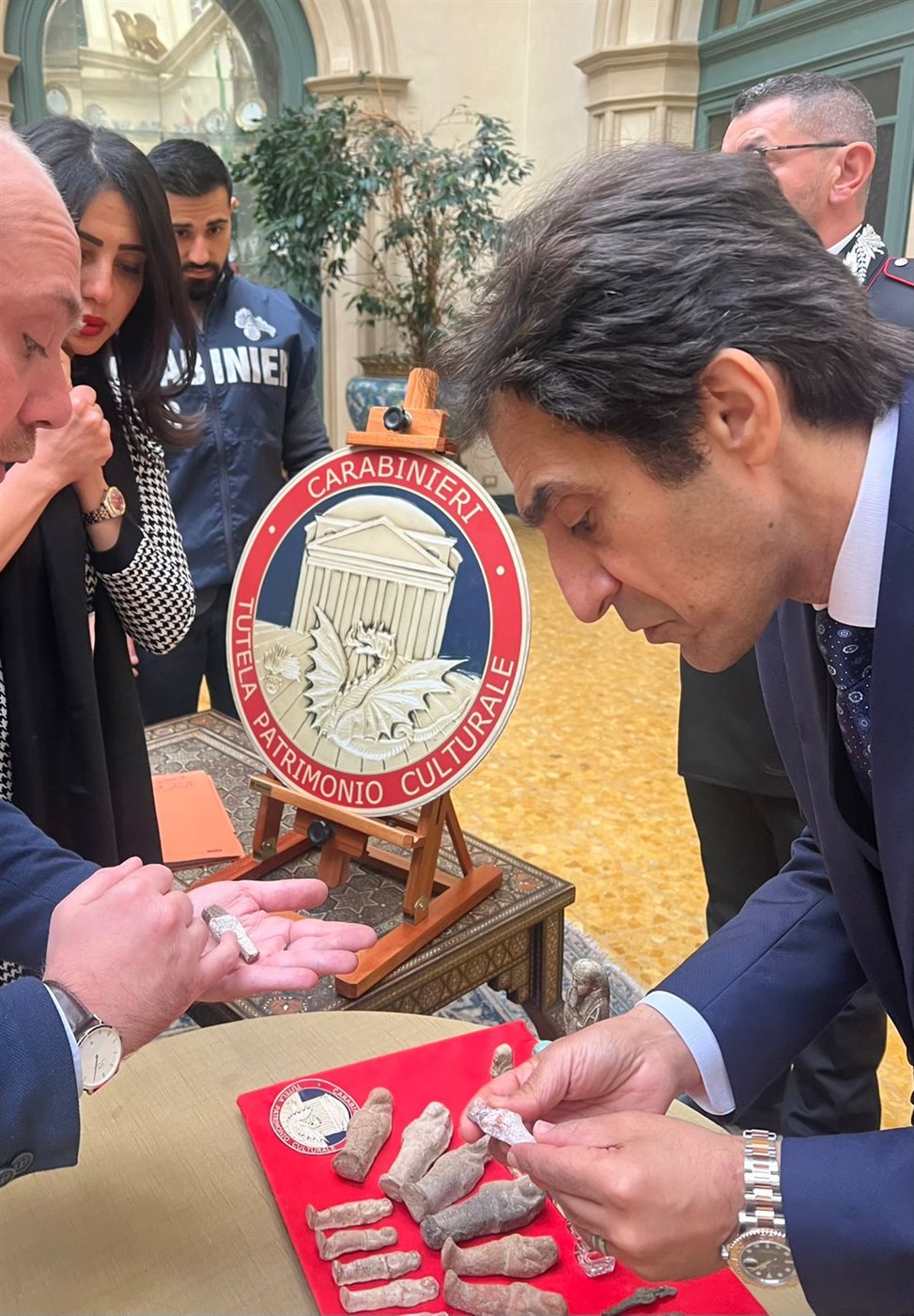 وقامت السلطات الإيطالية متمثلة فى الجهاز الأمنى الإيطالى الكاربنيارى (قوات الدرك) بتسليم السفارة رسميًا القطع الأثرية التى عثر عليها مؤخرًا، وقد قامت مسؤولة السفارة بمتابعة الشؤون الثقافية والآثار المستشارة سارة عطية باستلام القطع تمهيدًا لنقلها إلى موطنها الأم مصر.