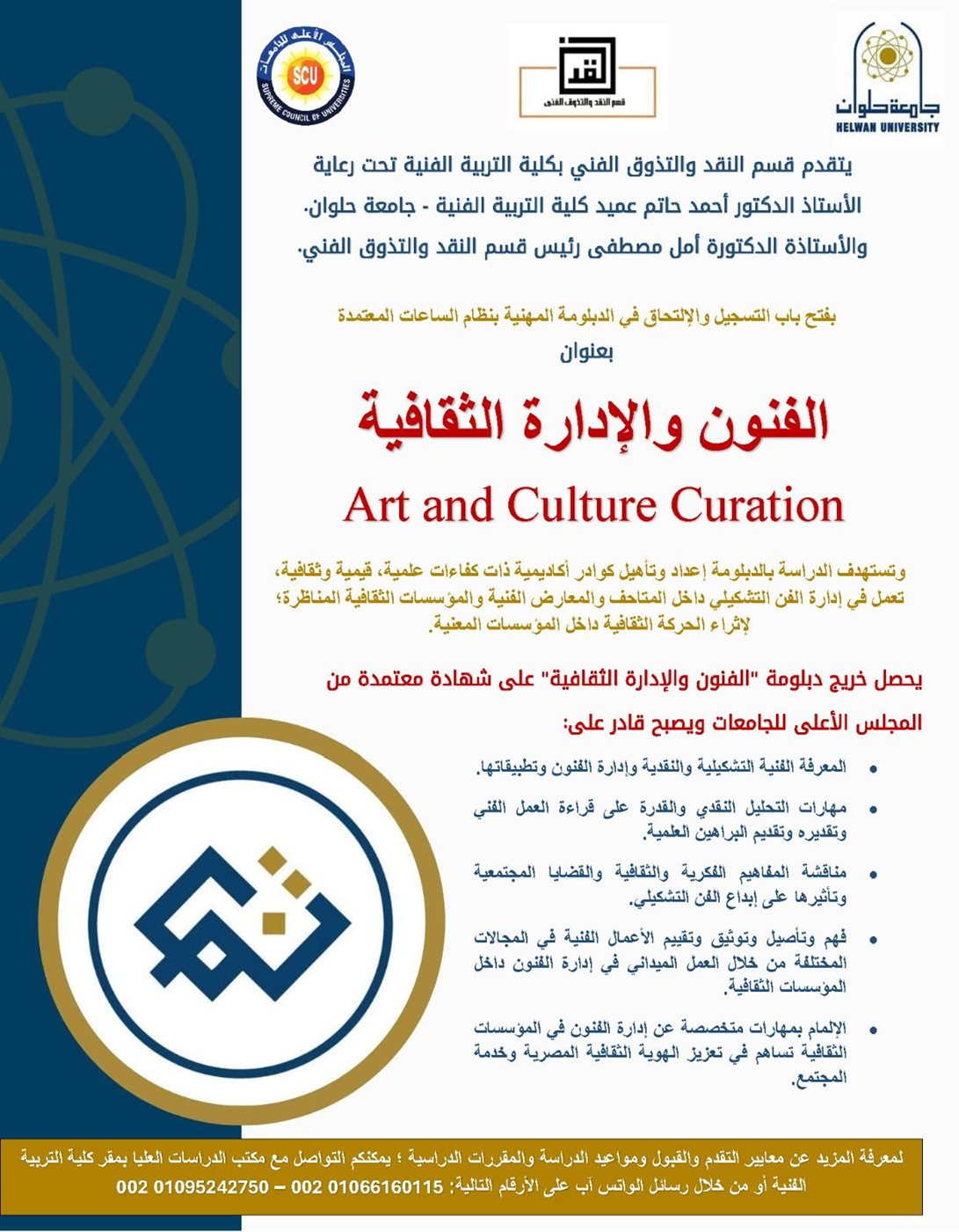 أعلن قسم النقد والتذوق الفني بكلية التربية الفنية بجامعة حلوان عن فتح باب التسجيل للدبلومة المهنية النوعية بعنوان "الفنون والإدارة الثقافية" للعام الأكاديمي الجديد، وذلك في إطار استراتيجية جامعة حلوان المتميزة لتطوير البرامج الأكاديمية المؤهلة لسوق العمل، تحت رعاية الدكتور السيد قنديل رئيس الجامعة.