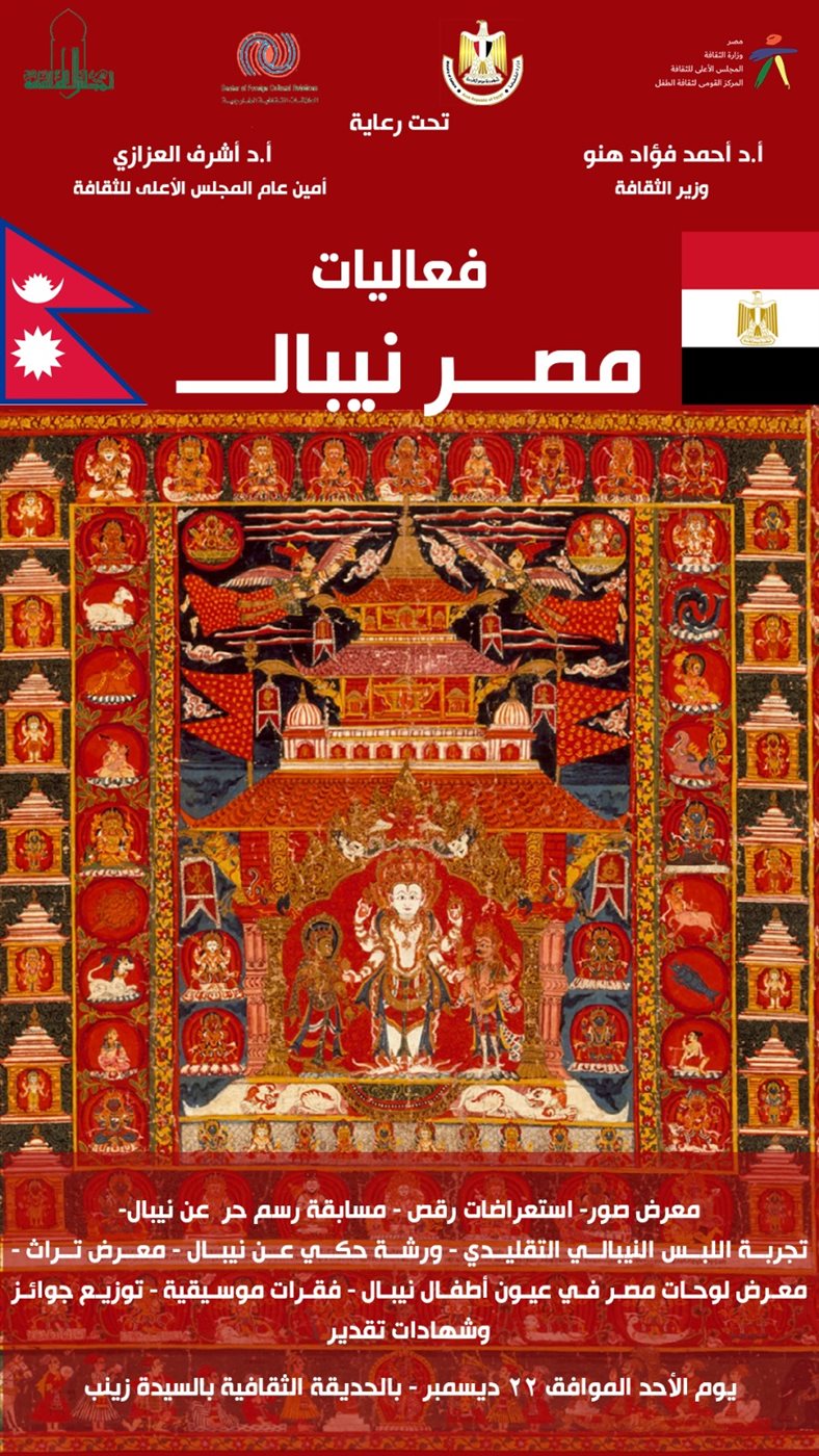 ينظم المركز القومي لثقافة الطفل بالتعاون مع قطاع العلاقات الثقافية الخارجية، احتفالية ثقافية فنية بعنوان "يوم مصري نيبالي"، وذلك بالحديقة الثقافية للأطفال بالسيدة زينب يوم الأحد القادم 22 ديسمبر، ويتضمن اليوم مسابقات في الرسم وفن الأركيت والتصوير الفوتوغرافي، وتجربة الزي النيبالي التقليدي.