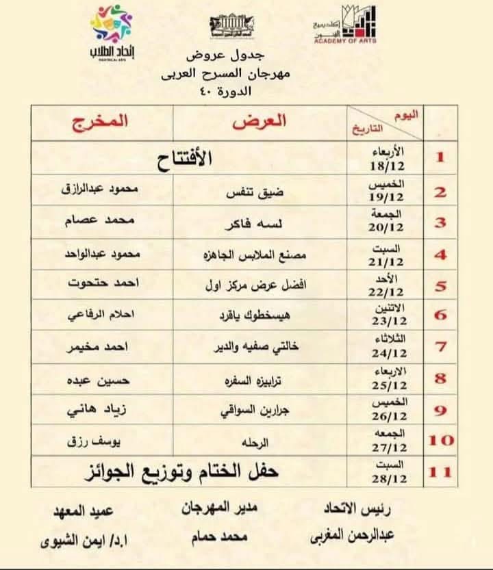 يشارك في مهرجان المسرح العربي بدورته الـ 40 والذي ينظمه المعهد العالي للفنون المسرحية بأكاديمية الفنون برئاسة الدكتورة غادة جبارة، 9 عروض متنوعة لطلاب ودارسي المعهد.