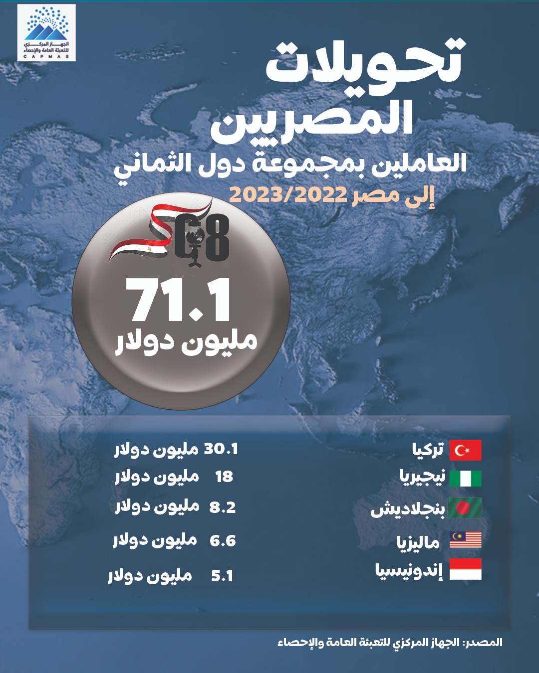 واحتلت تركيا المرتبة الأولى في قيمة التحويلات العاملين من مجموعة الدول الثماني النامية بمصر حيث بلغ قيمة تحويلات العاملين من تركيا بمصر 10.7مليون دولار، ثم اندونيسيا 3.6 مليون دولار، ثم نيجيريا 2.7 مليون دولار ثم ماليزيا 2.3 مليون دولار، ثم باكستان 1.3 مليون دولار ثم بنجلاديش 174 ألف دولار.