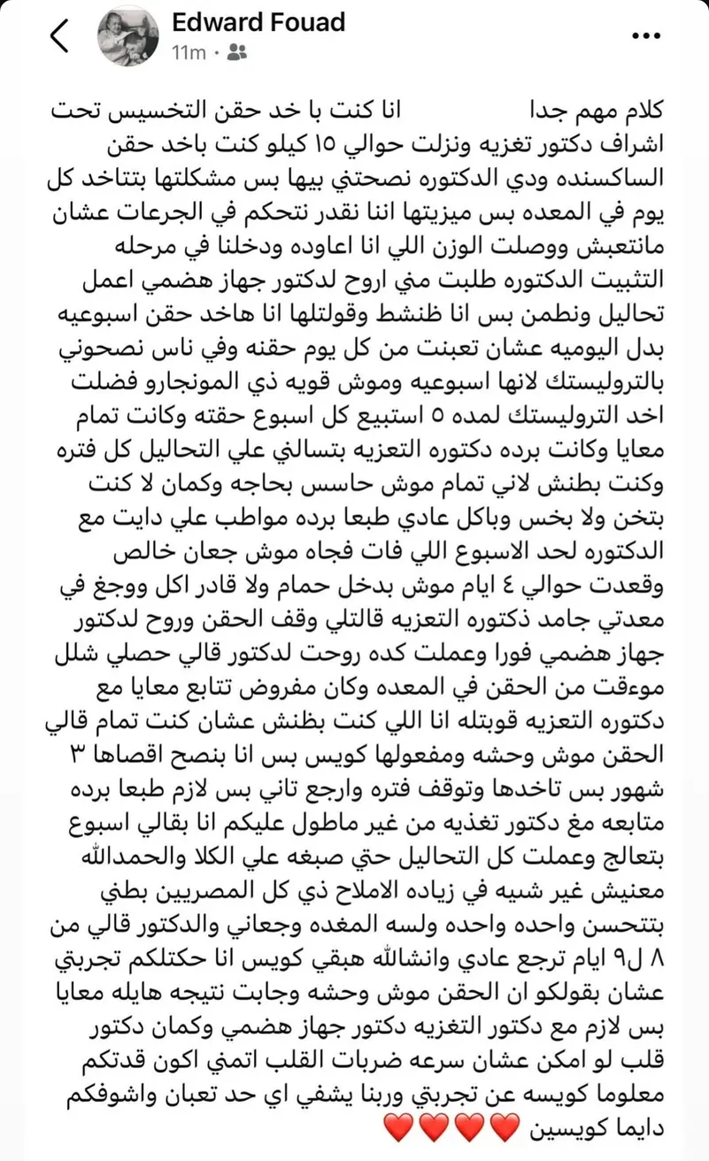 وقام إدوارد بنقل نصيحة الطبيب بأن استخدام حقن التخسيس يجب أن يكون لفترة محدودة لا تتجاوز 3 أشهر مع متابعة مستمرة مع أطباء متخصصين، بينهم طبيب تغذية، وطبيب جهاز هضمي، وأحيانا طبيب قلب بسبب تأثيرها على ضربات القلب.