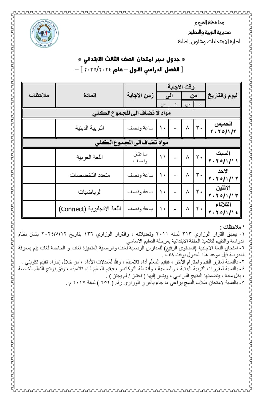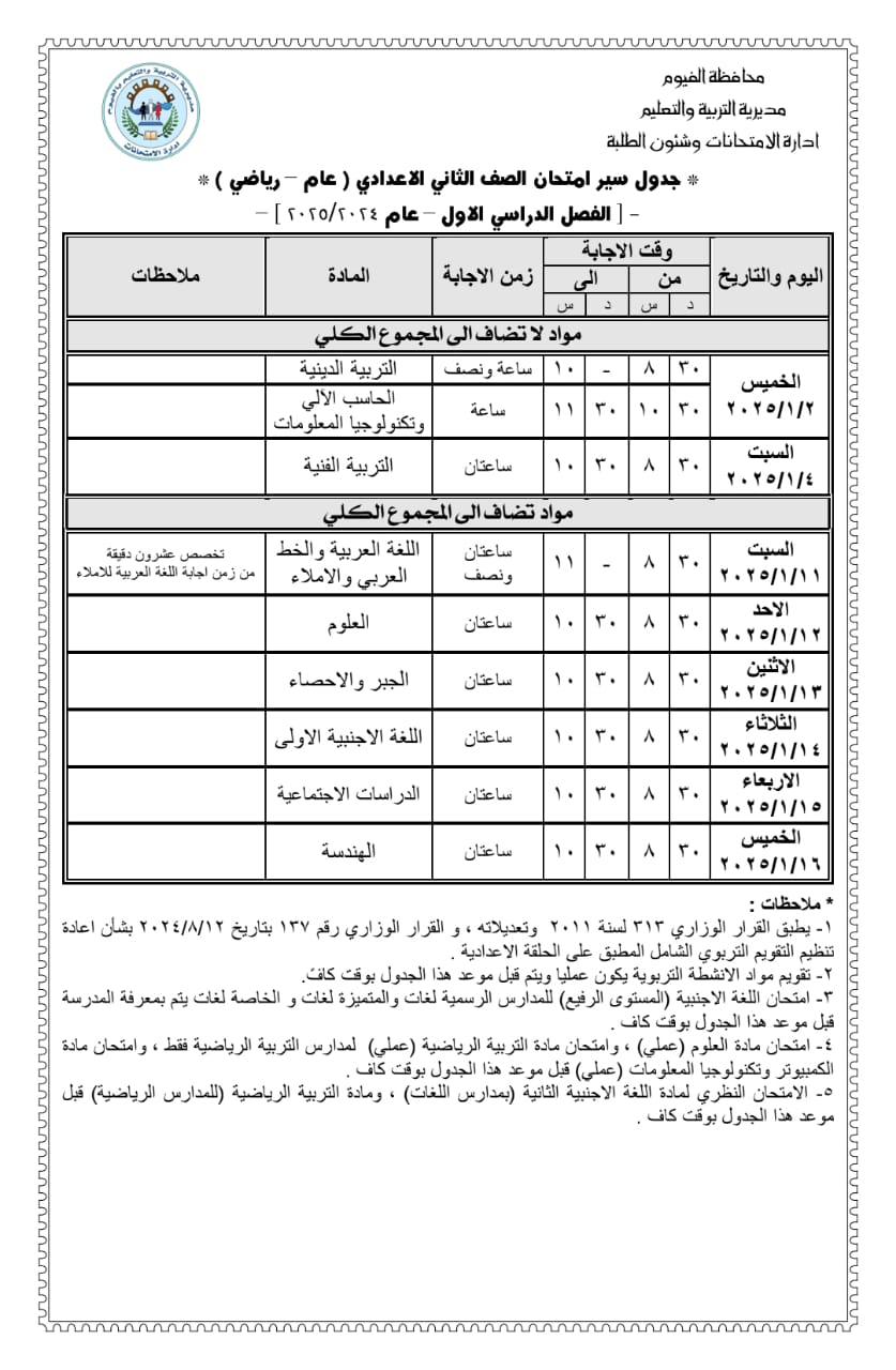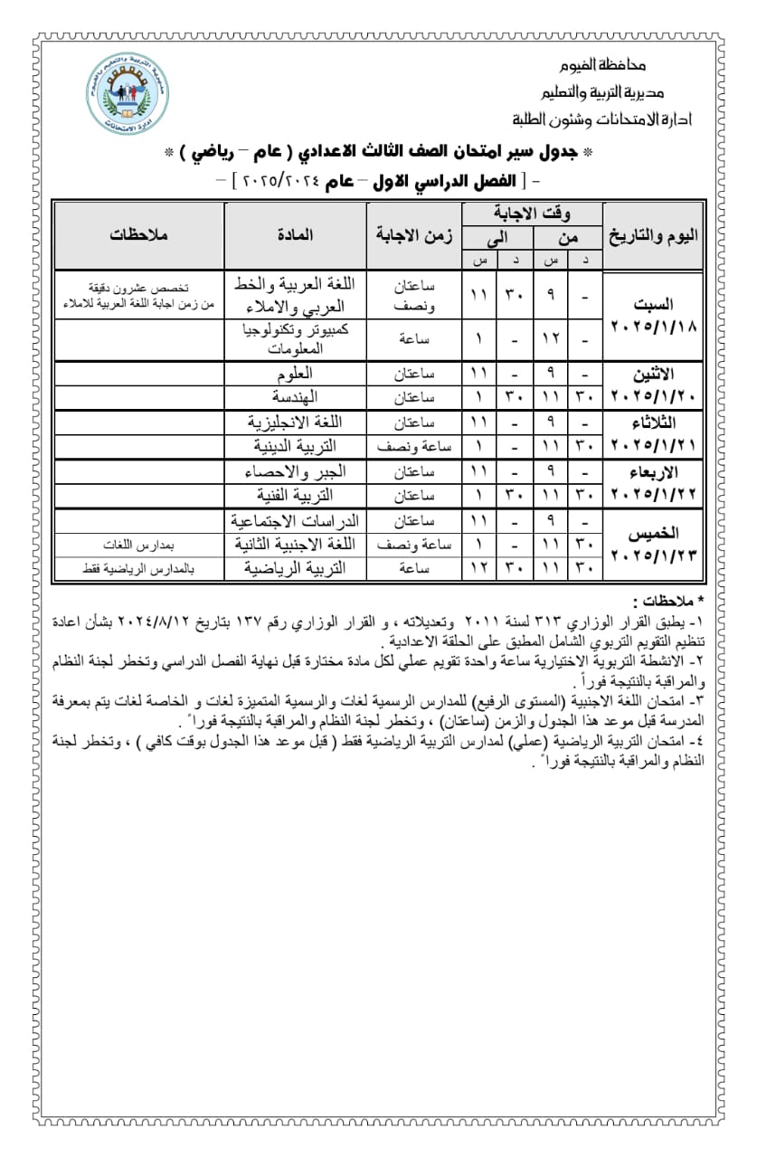 وقال الدكتور خالد قبيصي وكيل وزارة التربية والتعليم بمحافظة الفيوم، أن امتحانات الشهادة الإعدادية تبدأ يوم 18 يناير المقبل، وتنتهي يوم 23 من نفس الشهر، وتعقد امتحانات مواد المستوى الرفيع للمدارس الرسمية للغات والرسمية المتميزة، والمدارس الخاصة للغات، والمواد التي لا تضاف للمجموع الكلي، والمواد العملية قبل موعد انعقاد امتحانات المواد الأساسية، كل إدارة تعليمية حسب ظروفها، ويتم مراعاة عدم انعقاد أي امتحانات أيام أعياد الأقباط.