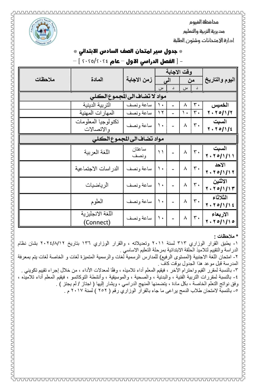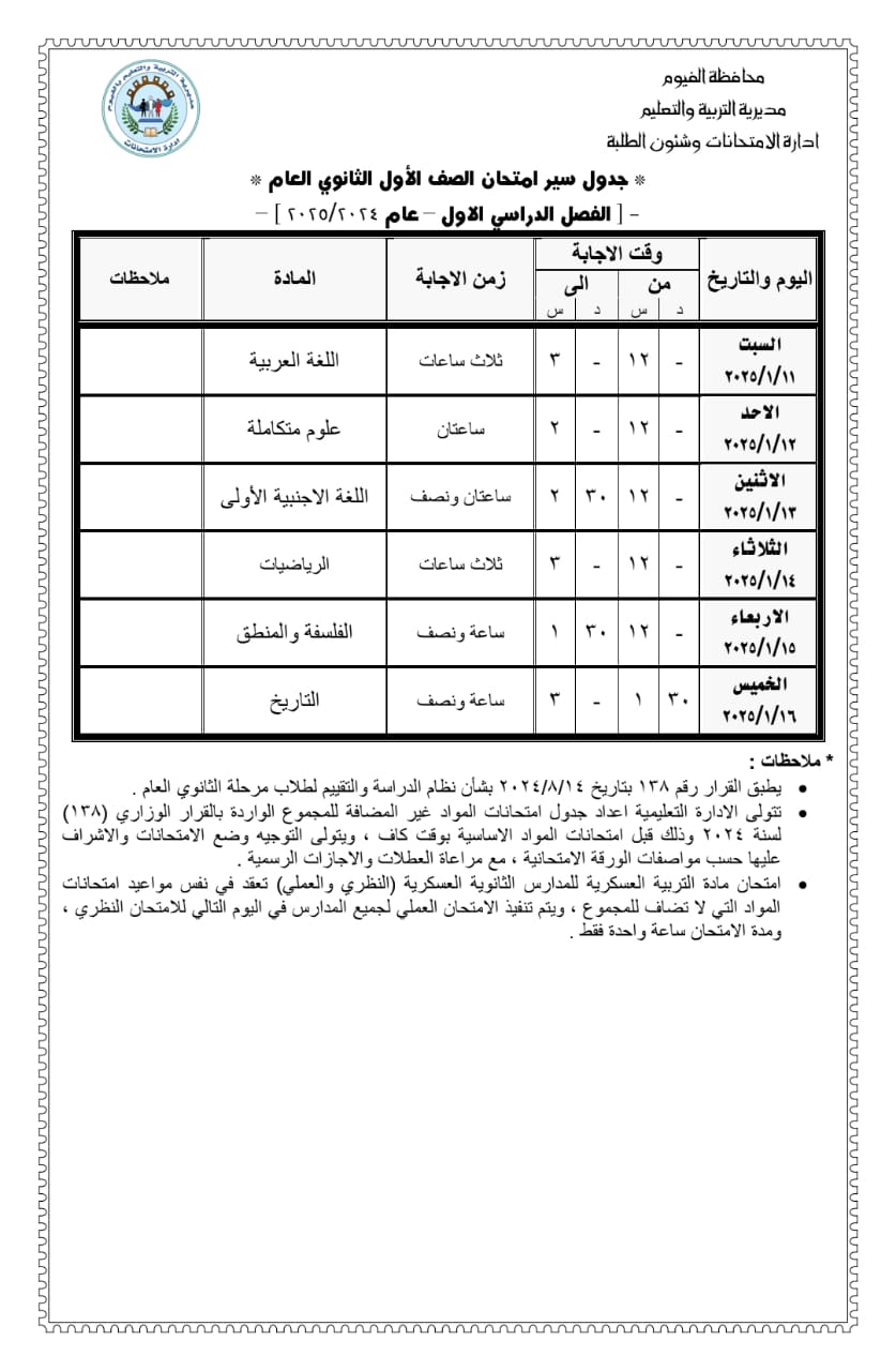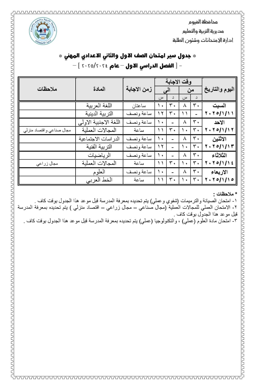 محافظ الفيوم يعتمد جداول امتحانات النقل للشهادة الإعدادية