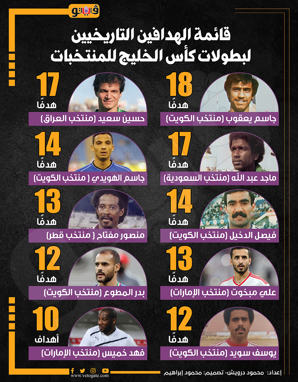 قائمة الهدافين التاريخيين لبطولات كأس الخليج للمنتخبات (إنفوجراف)