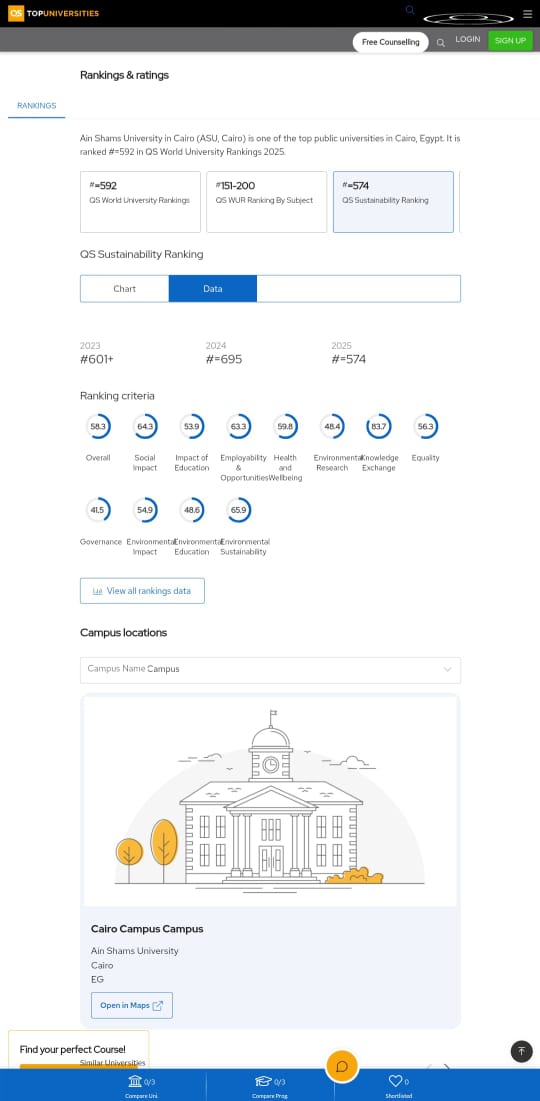 حققت جامعة عين شمس تقدما على مستوى العالم فى تصنيف QS sustainability المعنى بتصنيف الجامعات وفقا لتحقيق أهداف التنمية المستدامة، وذلك فى نسخته الجديدة بواقع ١٢١ مركزًا، حيث أصبحت فى المركز ٥٧٤ عالميًا والثانى محليًا بعد أن كانت فى المركز ٦٩٥ العام الماضى.