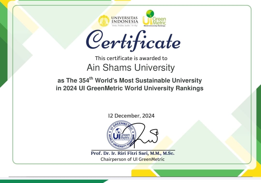 و فى ذات السياق، وفى تصنيف المقياس الأخضر Green Metric للجامعات الأكثر تحقيقًا للنمو الأخضر وتحقيق أهداف التنمية المستدامة، تقدمت الجامعة إلى المركز الخامس محليًا بعد أن كانت العام الماضى فى المركز السادس محليًا، وعلى المستوى العالمى احتلت الجامعة المرتبة ٣٥٤ عالميا من بين ١٤٧٧ جامعة ومؤسسة أكاديمية تقدمت للتصنيف هذا العام، وذلك بعد انضمام ٢٩٠ جامعة جديدة للتصنيف العام الحالى، وبذلك تقدم تصنيف جامعة عين شمس ليصبح من بين أفضل ٢٤ % من جامعات العالم فى تحقيق الاستدامة البيئية.