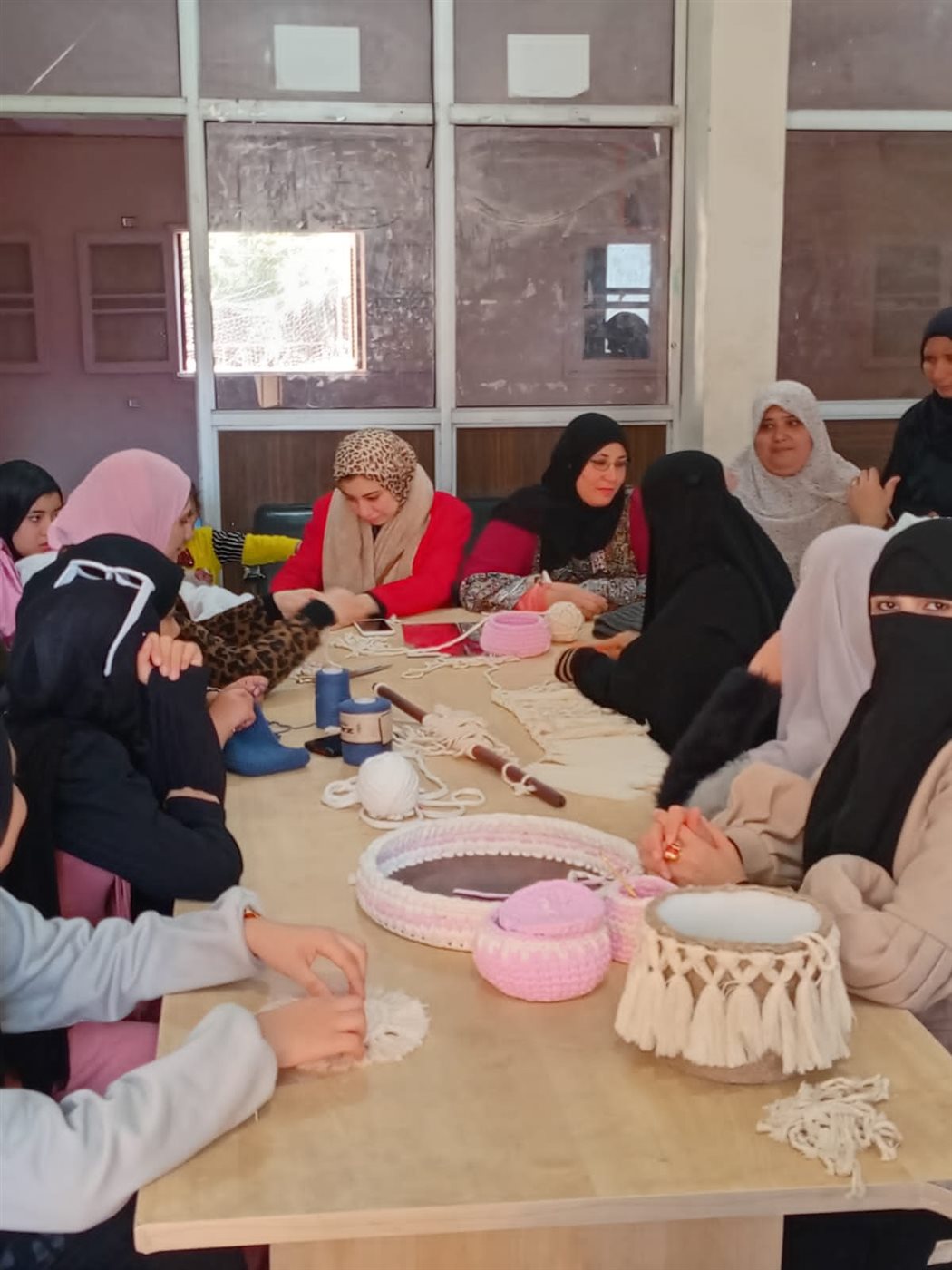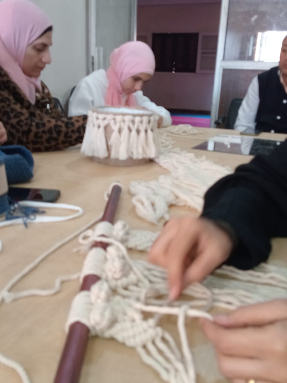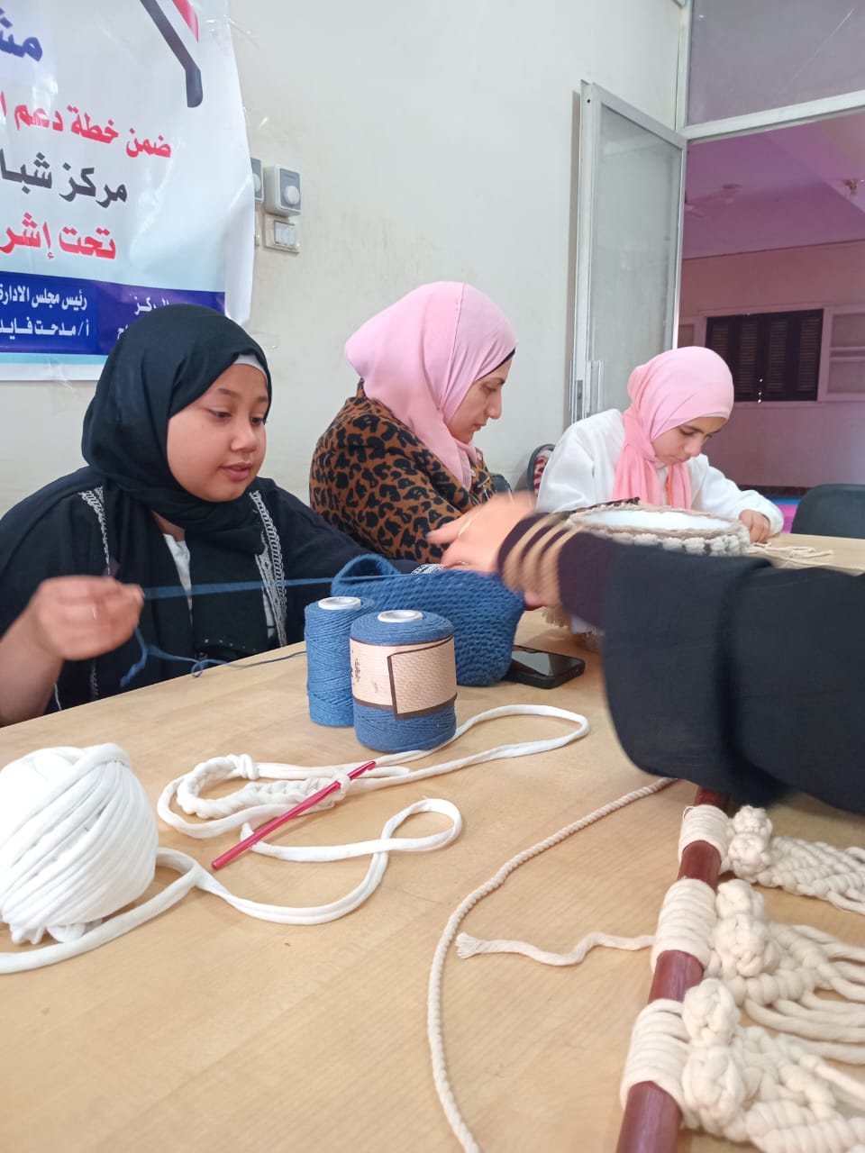 تعريف المتدربات على الخامات المستخدمة، ونوع الخيط المستخدم في عمل المرجيحة