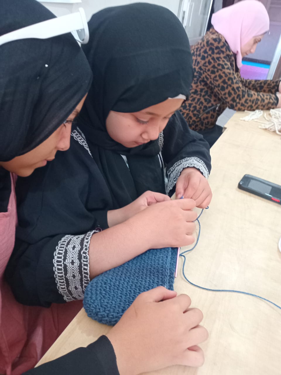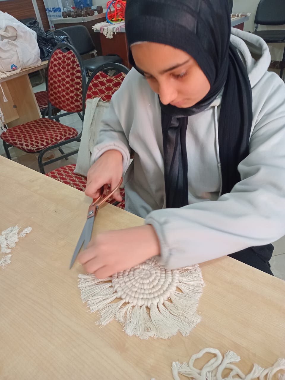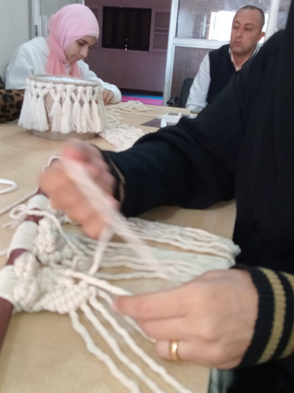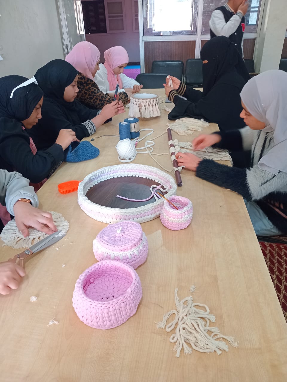 تعريف المتدربات على الخامات المستخدمة، ونوع الخيط المستخدم في عمل المرجيحة