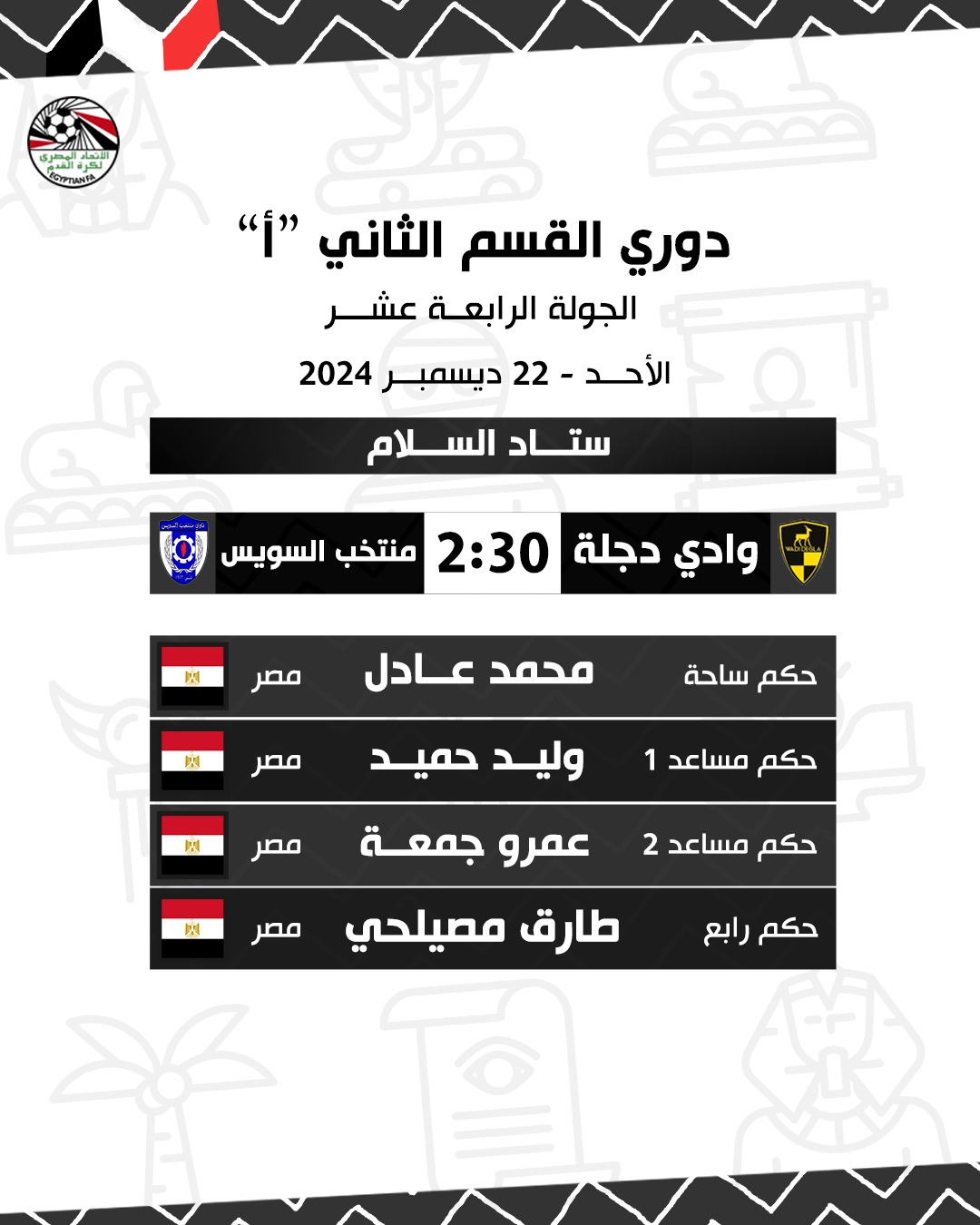 طاقم حكام مباراة وادي دجلة ضد منتخب السويس