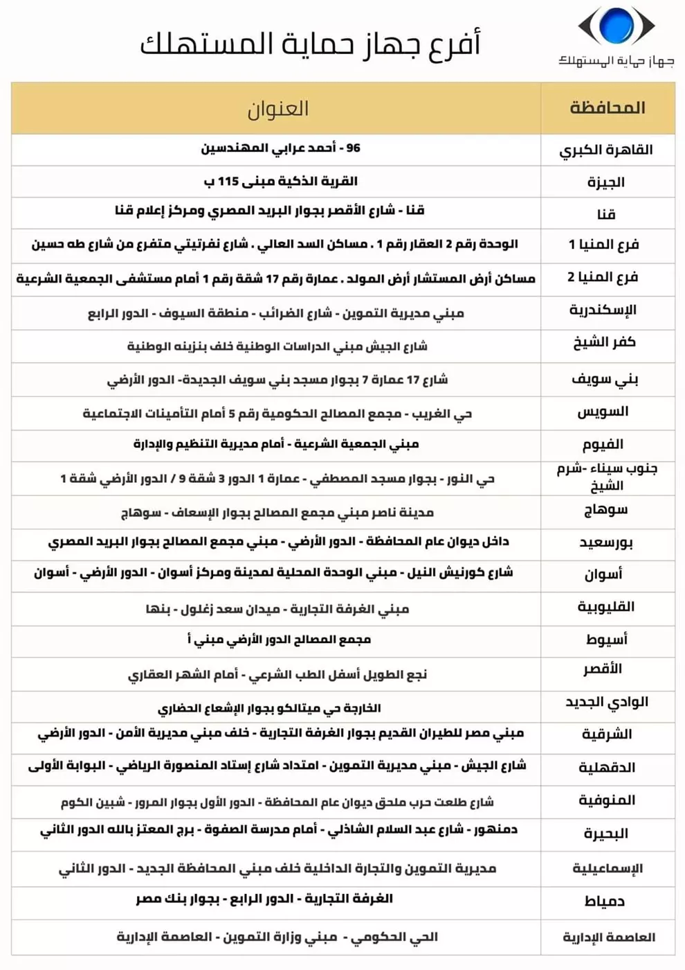 كما أعلن جهاز حماية المستهلك عن عناوين أفرع الجهاز بجميع المحافظات لتلقي شكاوى المواطنين.