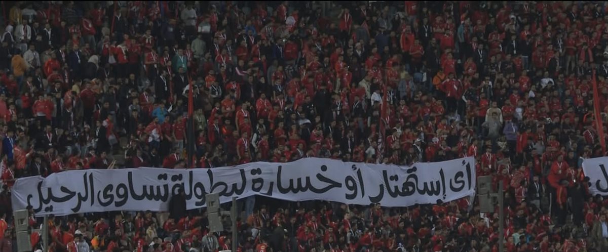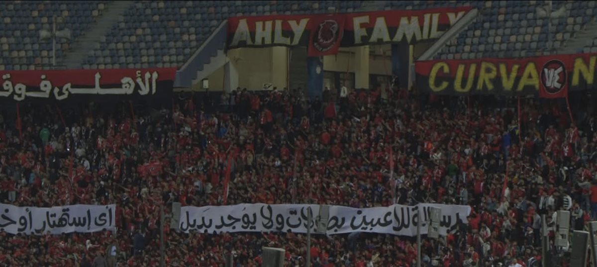 ورفعت جماهير الأهلي لافتات تحمل رسالة للاعبي الفريق جاءت كالتالي " رسالة للاعبين بطولات ولا يوجد بديل.. أي استهتار أو خسارة لبطولة تساوي الرحيل.