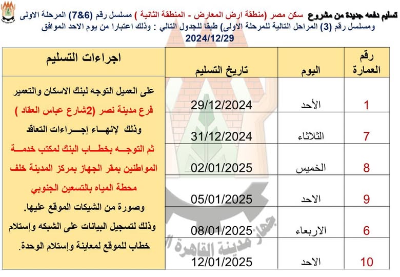 كشفت وزارة الإسكان والمرافق والمجتمعات العمرانية عن تسليم دفعة جديدة من مشروع سكن مصر (منطقة أرض المعارض - المنطقة الثانية) مسلسل رقم (6&7) المرحلة الأولى ومسلسل رقم (3) المراحل التالية للمرحلة الأولى) وذلك اعتبارًا من يوم الأحد الموافق 2024/12/29.