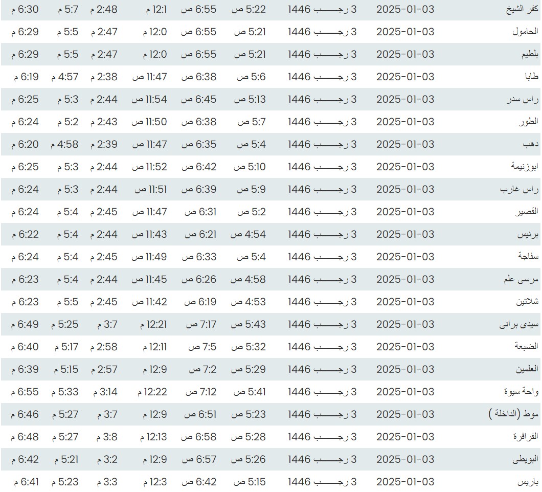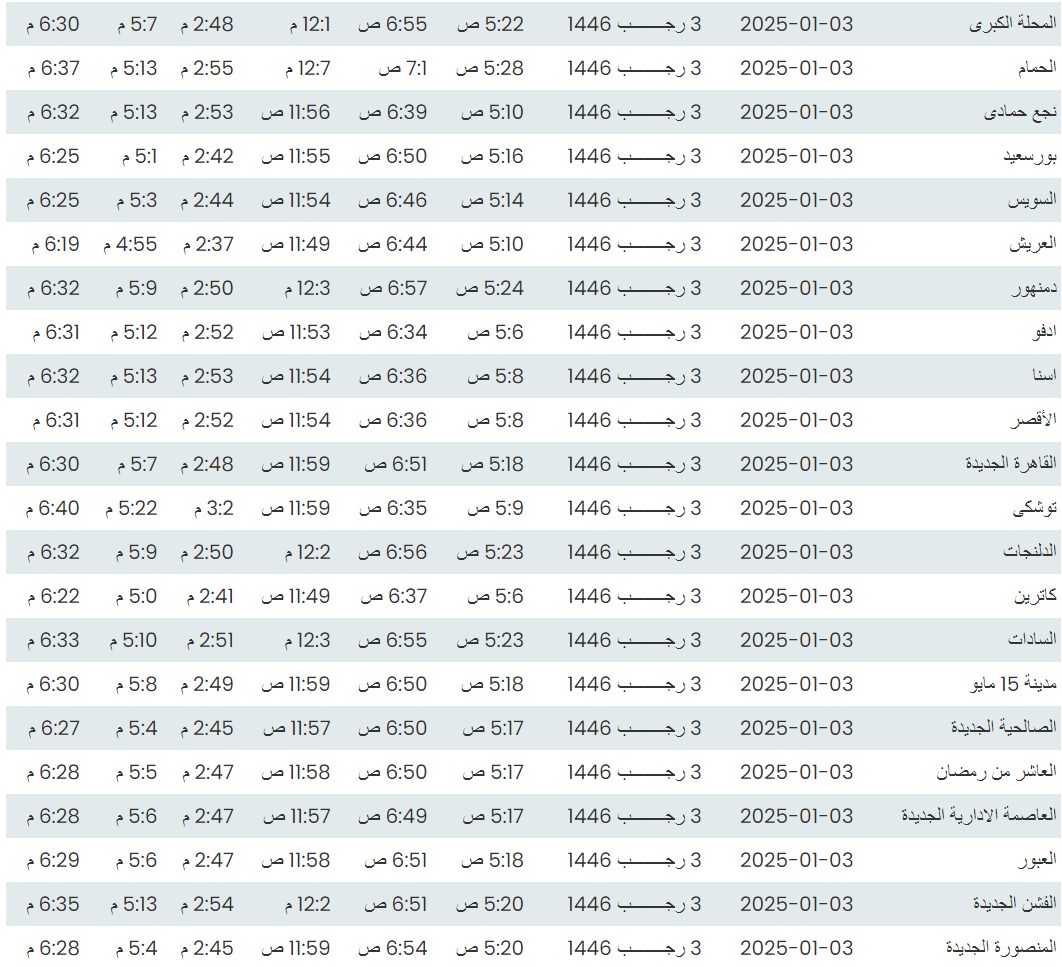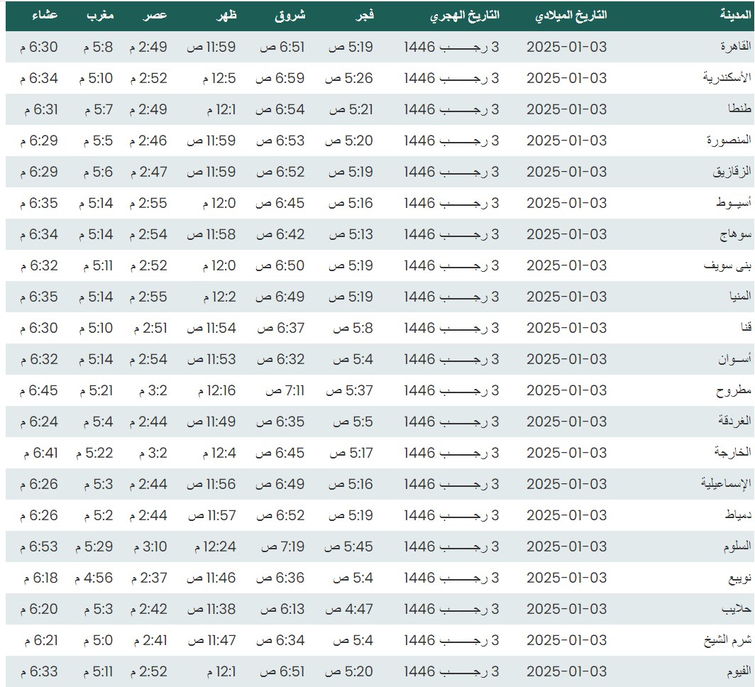 وفيما يلي مواقيت الصلاة، لعدد من مدن ومحافظات الجمهورية من واقع بيانات الهيئة العامة للمساحة
