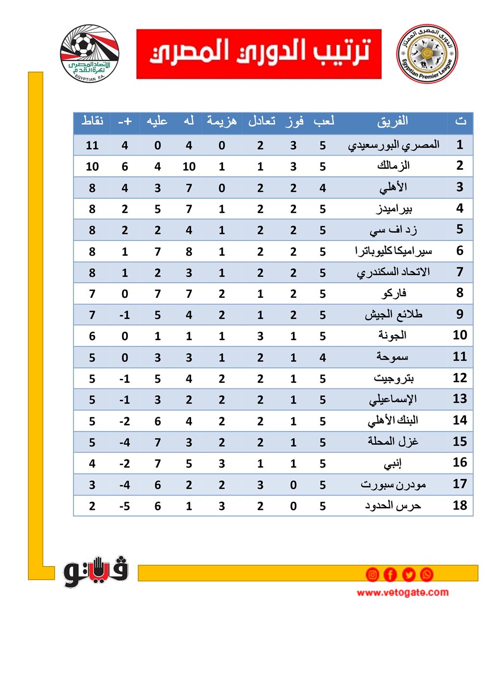 ترتيب الدوري المصري، يتصدر المصري البورسعيدي جدول ترتيب الدوري المصري الممتاز برصيد 11 نقطة، ويليه الزمالك في المركز الثاني برصيد 10 نقاط، ثم الأهلي في المركز الثالث قبل انطلاق مباريات اليوم الثلاثاء في افتتاح الجولة السادسة من البطولة.