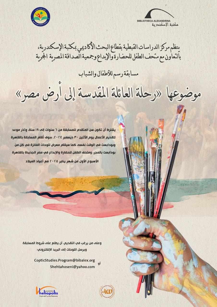 يشارك متحف الطفل فى مسابقة رسم بعنوان "رحلة العائلة المقدسة فى مصر"، الموجه للأطفال والشباب من سن 6 وحتى 19 عاما، وذلك بالتعاون مع مركز الدراسات القبطية بمكتبة الإسكندرية وجمعية الصداقة المصرية المجرية.